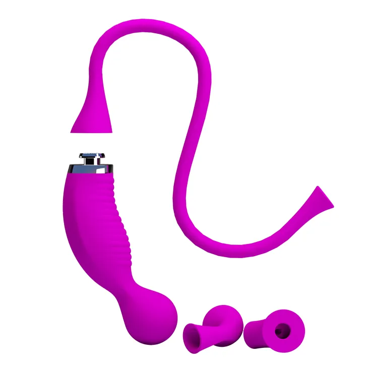 Двусторонний вибростимулятор пурпурного цвета. Имеете 12 режимов вибрации и 12 функций всасывания. 3 сменные насадки, USB, мешочек для хранения в комплекте. Упаковка: картонная коробка с принтом.