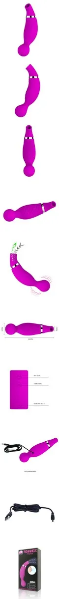 Двусторонний вибростимулятор пурпурного цвета. Имеете 12 режимов вибрации и 12 функций всасывания. Диаметр всасывающего кончика - 1,5 см. В комплекте USB и мешочек для хранения. Упаковка: картонная коробка с принтом.