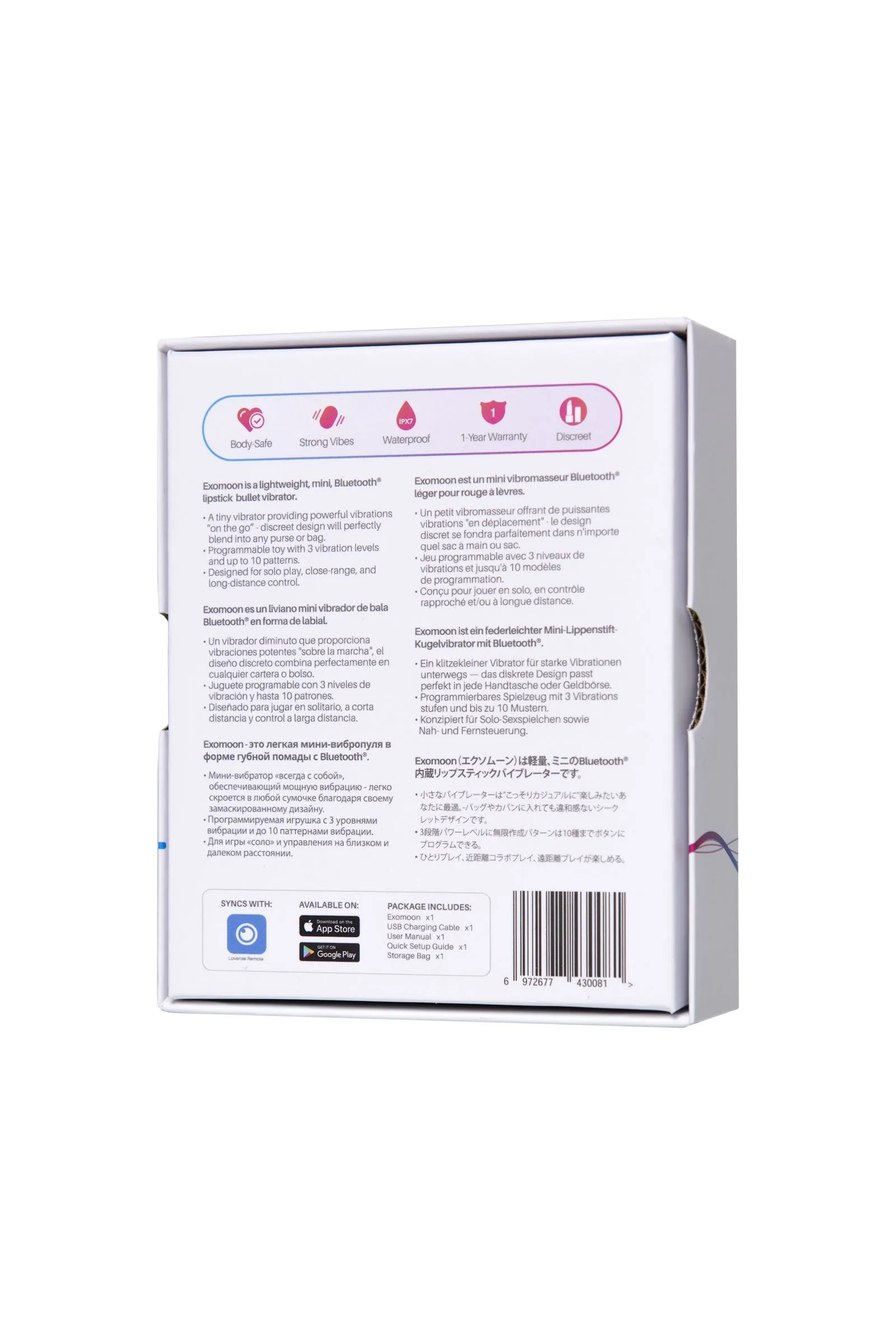 Маленький мини-вибратор Exomoon в форме губной помады с Bluetooth от бренда Lovense вызывает блеск глаз и улыбку. Тайный, незаметный, но очень мощный – он стал воплощением высоких технологий для наивысшего удовольствия. Красота и функциональность. Инновационная форма вибратора в форме шикарной губной помады. Никто не заметит ваш маленький секрет в сумочке или косметичке. Легкий и маленький – его можно взять с собой куда угодно, ведь он идеально скроется даже на туалетном столике. Черный матовый корпус, благородный алый цвет стимулятора и бронзовая кнопка управления – все вместе это создает эффект роскошного девайса. Взрывная мощь. Несмотря на миниатюрный размер Exomoon обладает сверх сильными проникающими вибрациями и широким диапазоном мощности. От самого легкого уровня до потрясающих волн наслаждения. Используйте как основной или дополнительный девайс для стимуляции любых эрогенных зон во время прелюдии, соло и с партнером. Гладкое силиконовое покрытие и сверхсильные вибрации обеспечивают мульти оргазмы. Программируемая функция. Неограниченные возможности Lovense Remote позволяют управлять Exomoon через приложение. Возможность запрограммировать паттерны и интенсивность вибрации по своему вкусу и сохранить их для дальнейшего использования – до 10 любимых паттернов. Lovense Remote позволяет использовать музыкальный режим, звуковую активацию и настраивать уровень мощности, соответствующий индивидуальным потребностям пользователя. Стабильное подключение. Антенна новейшего поколения и чип Bluetooth понравится любителям виртуальных удовольствий, а значит можно передать контроль над процессом своему партнеру независимо от расстояния. Идеальный подарок. Exomoon станет отличным выбором для подарка в дополнение к любой коллекции секс-игрушек, так и в качестве первой игрушки. 3 уровня мощности 10 паттернов вибрации Водонепроницаемость IPX7 Скрытый магнитный зарядный порт, USB зарядка Работает с приложением и без Зарядка 125 минут Время работы до 177 минут В режиме ожидания до 100 часов Что в комплекте: Мини-вибратор в форме губной помады с Bluetooth USB Кабель для подзарядки Руководство пользователя Сумка для хранения