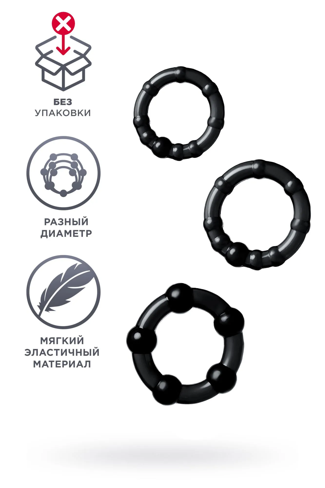 Набор из трех эрекционных колец на пенис, сделанных из мягкого материала высокого качества. Они одного цвета, но разного диаметра и универсальные – хорошо растягиваются до нужного размера. Мужчина получает длительную стойкую эрекцию, оттягивая преждевременную эякуляцию.
