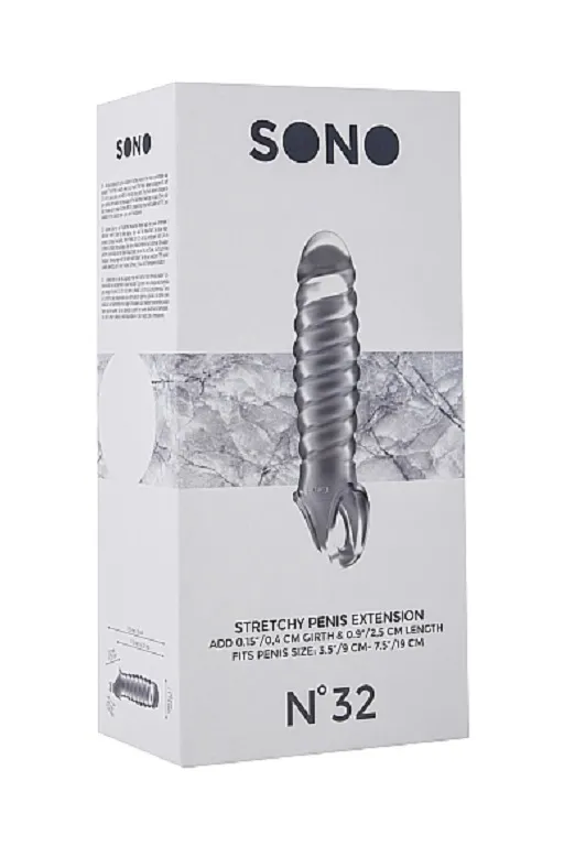 No.32 Stretchy Penis Extension – насадка закрытого типа для небольшого увеличения длины и обхвата полового члена с кольцом для фиксации на мошонке. Она имеет округлую головку и спиралевидную форму для более оптимальной стимуляции. Насадка произведена из высококачественного мягкого материала.