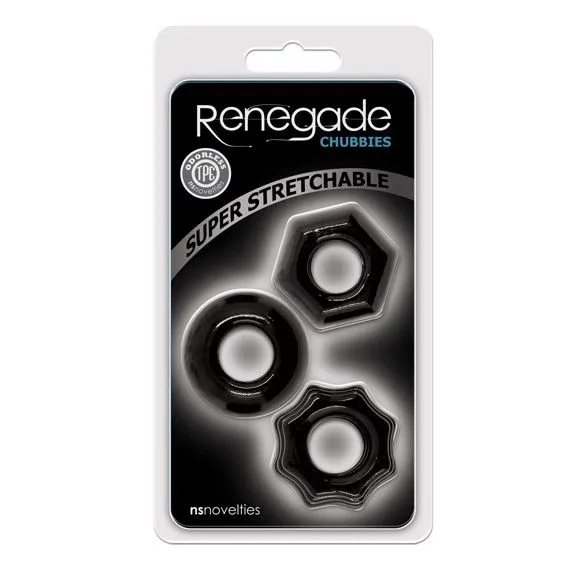 Супер эластичные эрекционные кольца Renegade Chubbies от NS Novelties подходят для любого диаметра члена. Можно использовать одно или все три сразу, комбинируйте так чтобы вам было комфортно и продлите удовольствие себе и партнёрше.