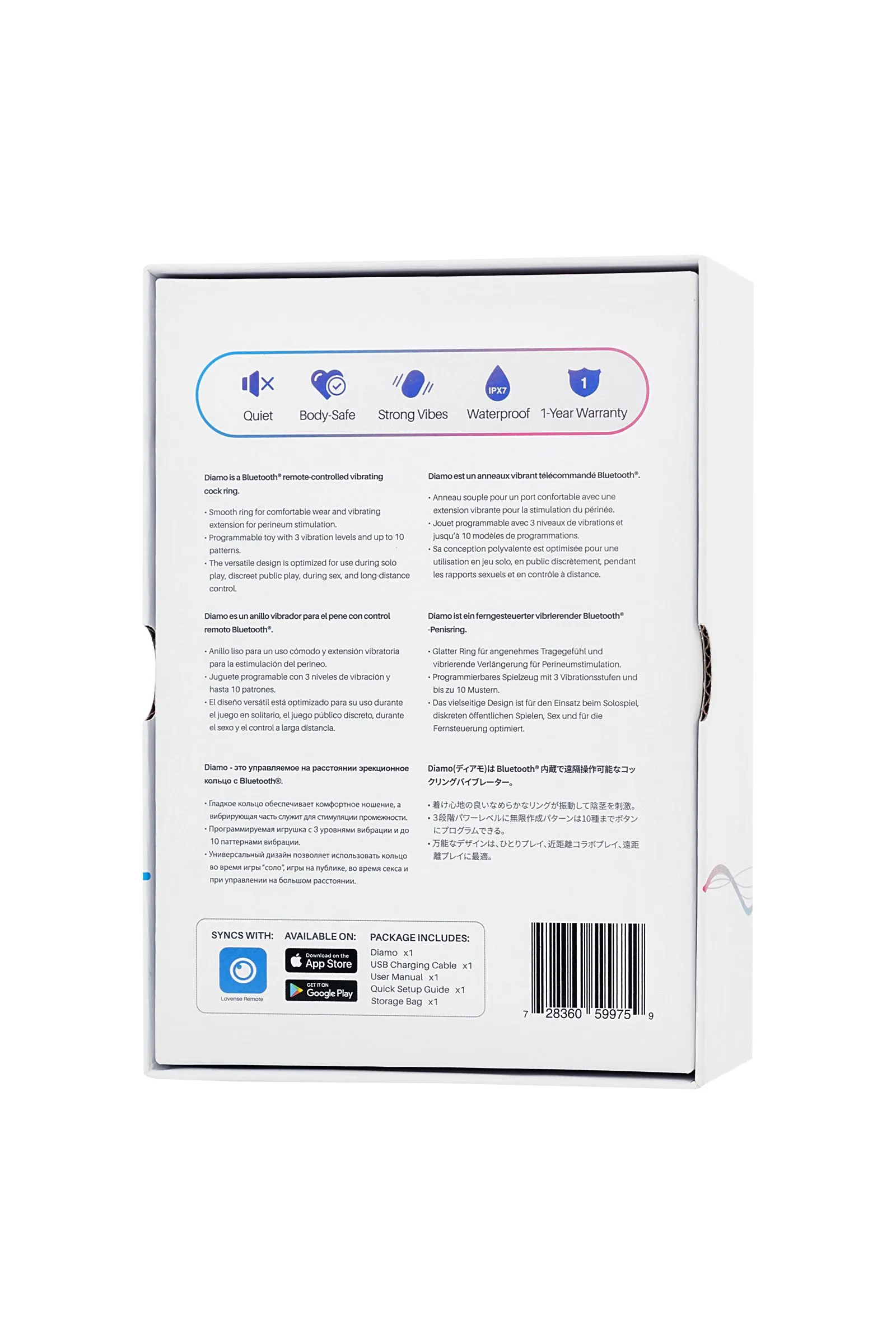 Встречайте Diamo от Lovense – инновационное эрекционное виброкольцо с управлением через приложение, которое подарит вам более сильную и продолжительную эрекцию, а также мощные оргазмы. Diamo – идеальное носимое устройство для мужчин, которые хотят наслаждаться новыми ощущениями без использования анальных игрушек. Это удобное виброкольцо станет прекрасным спутником в ваших сексуальных приключениях и позволит вам экспериментировать даже в публичных местах. Diamo – универсальное виброкольцо и предлагает несколько вариантов ношения для различных сценариев игры. Оно идеально подходит для соло-игр, прелюдии и секса. Вы сможете наслаждаться мощными вибрациями, направленными на вашу промежность, в то время как ваша партнерша будет чувствовать вибрации от кольца на своем клиторе. Diamo приведет вас к незабываемому наслаждению, разделяемому вдвоем. С помощью функции дистанционного управления вы сможете дразнить и сводить партнера с ума во время горячей прелюдии. А функция звука позволит активировать Diamo, реагируя на ваши стоны и создавая потрясающие импульсивные ощущения. Diamo обладает самым широким диапазоном управления среди всех носимых Bluetooth-вибраторов. Его эластичное эрекционное кольцо имеет размер внутреннего диаметра 43 мм и подходит для любого размера. Гладкий и мягкий силикон обеспечивает комфортное длительное ношение, усиливая эрекцию и оттягивая оргазм. Кроме того, вибрации кольца приятно стимулируют обоих партнеров, делая Diamo идеальным выбором для пар. Не беспокойтесь о шуме - Diamo тихий в использовании. Вы сможете наслаждаться эротическими моментами на свежем воздухе и в публичных местах, а максимальный уровень звука составляет всего 46 дБ. Мощный мотор обеспечивает интенсивные вибрации, которые дарят длительные и насыщенные ощущения, а время использования до 175 минут и режим ожидания до 120 часов позволяют улучшать свой сексуальный опыт и наслаждаться Diamo в любое время. 3 уровня мощности 10 паттернов вибрации Водонепроницаемость IPX7 Магнитный зарядный порт, USB зарядка Управление на расстоянии Время работы до 175 минут, время зарядки 1 час В режиме ожидания до 120 часов Что в комплекте: Эрекционное виброкольцо с управлением на расстоянии Diamo с Bluetooth USB Кабель для подзарядки Руководство пользователя Сумка для хранения