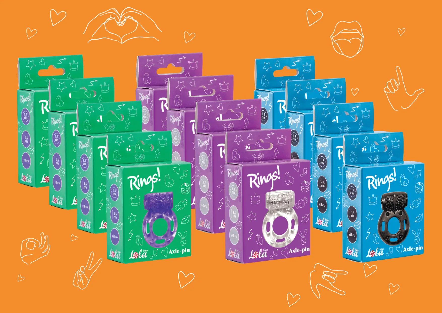 Шоубокс Axle-pin включает 12 эрекционных колец, представленных в трех стильных цветах, по четыре кольца каждого цвета. Эти кольца изготовлены из TPR — эластичного и приятного на ощупь материала, обеспечивающего комфорт при использовании. Эргономичная форма колец подходит для любого размера и гарантирует надежную фиксацию. Кольца разработаны для усиления стимуляции обоих партнеров, что обеспечивает более продолжительное удовольствие и стимуляцию различных эрогенных зон, включая клитор и мошонку. Каждое кольцо оснащено одним режимом вибрации, работающим от батареек-таблеток, которые входят в комплект.