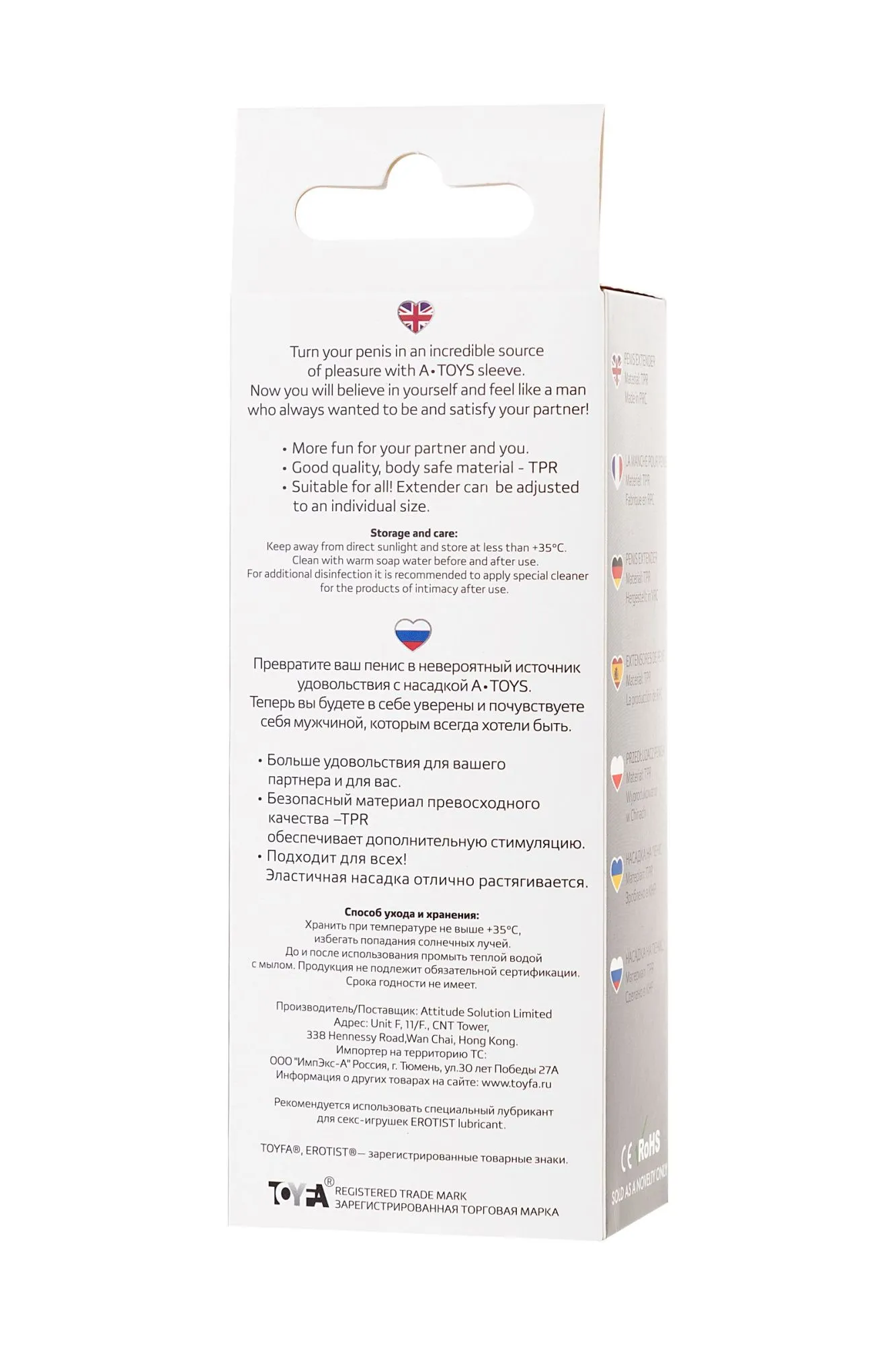 Превратите ваш пенис в невероятный источник удовольствия с насадками A-Toys Tark. Теперь вы будете в себе уверены и почувствуете себя мужчиной, которым всегда хотели быть и удовлетворить своего партнера! • Гарантированное и мгновенное увеличение пениса без операций и таблеток! • Больше удовольствия для вашего партнера и для вас. • Превосходный, безопасный материал –TPR. •Подходит для всех! Эластичная насадка отлично растягивается.
