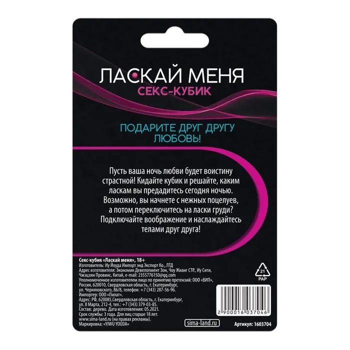 Правила здесь предельно просты. Бросайте кубик, выпавшая сторона подскажет, каким ласкам вы предадитесь сегодня ночью. Подарите друг другу незабываемое наслаждение!