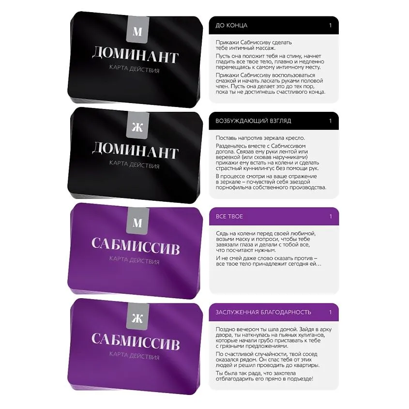 Этот набор позволит вам разнообразить сексуальную жизнь и добавить в неё немного перчинки. Вас ждут 20 карт действия для обоих партнёров из серии «50 оттенков страсти». Один из вас будет доминирующим, а другой — подчиняющимся. Решите, кто какую роль будет играть. Не забудьте использовать виброкольцо и плётку, чтобы сделать ощущения ещё приятнее.
