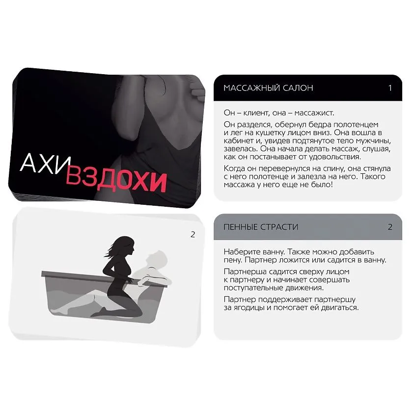 Этот набор позволит вам разнообразить сексуальную жизнь и добавить в неё немного перчинки. Вас ждут 20 карт с горячими ролевыми играми и позами для секса из серии «Ахи-вздохи», а также миниатюрный вибратор, который поместится в любой дамской сумочке.