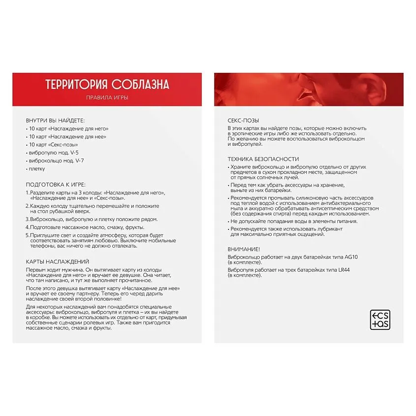 А ещё вас ждут карты с секс-позами, которые можно включить в эротические игры либо же использовать отдельно. В комплекте есть плётка, виброкольцо и вибропуля, которые можно использовать, чтобы добавить в ваши отношения перчинки, а также для экспериментов с подчинением.