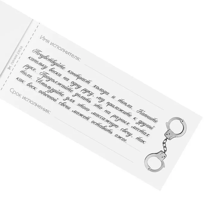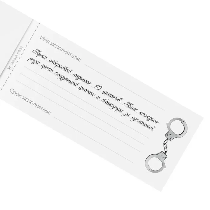 Купоны «Накажи меня» — это идеальный инструмент управления вашим партнёром. Выписывайте чеки и наслаждайтесь воплощением ваших тайных фантазий вместе! Как использовать купоны? Изучите книжку и выберите задания, которые понравились вам больше всего. На каждом купоне необходимо указать имя исполнителя и срок исполнения наказания. Осталось только вручить чек и ждать. Дарите друг другу наслаждение!