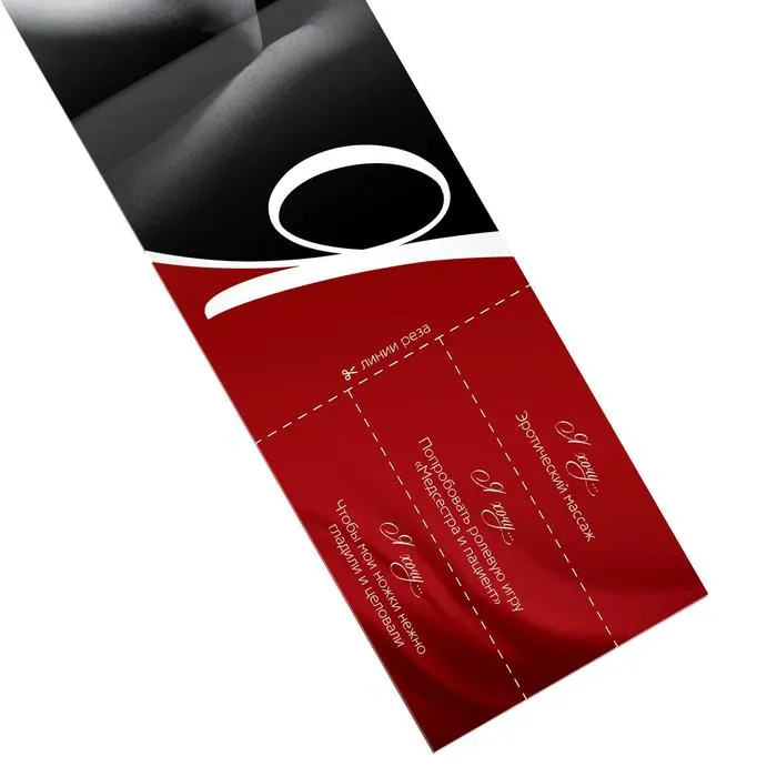 Очень хотели, но боялись спросить? Тогда эти купоны — то, что вам нужно! Здесь мы собрали самые пикантные эротические желания, которые предстоит выполнить вам и вашей второй половине. Как использовать купоны? Подготовьте задания (разрежьте по пунктирным линиям). Осталось только выбрать подходящие желания, по очереди вручать друг другу и воплотить написанное в жизнь. Невероятное удовольствие вам обеспечено! Дарите друг другу любовь и наслаждение!