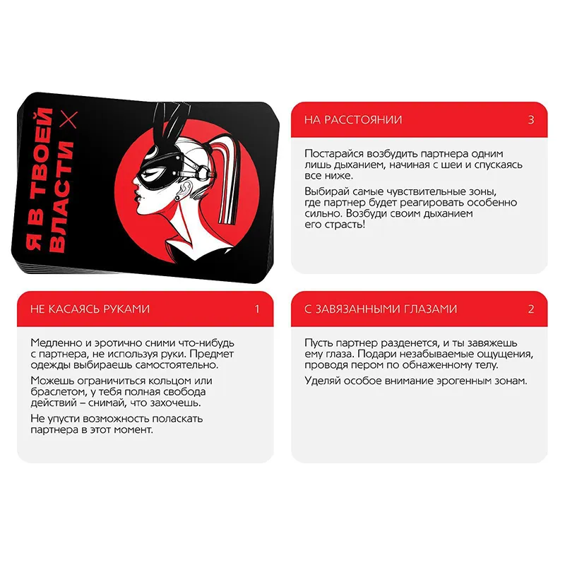 Любите экспериментировать? Эта игра обострит ваши чувства и накалит градус возбуждения между вами. Вытягивайте карты из колоды в любом порядке и выполняйте написанное, не забывая об ограничениях в каждом задании.