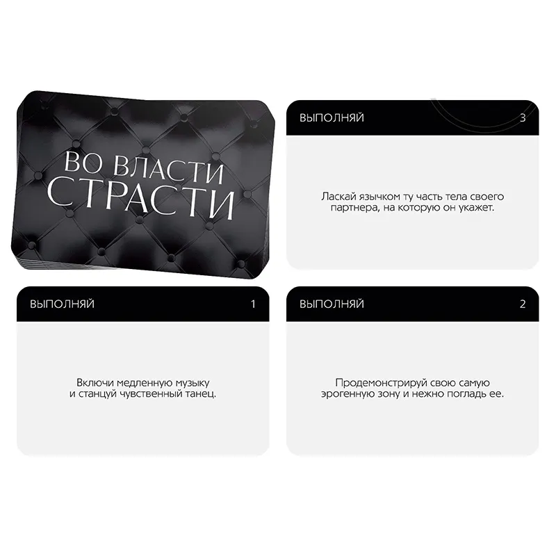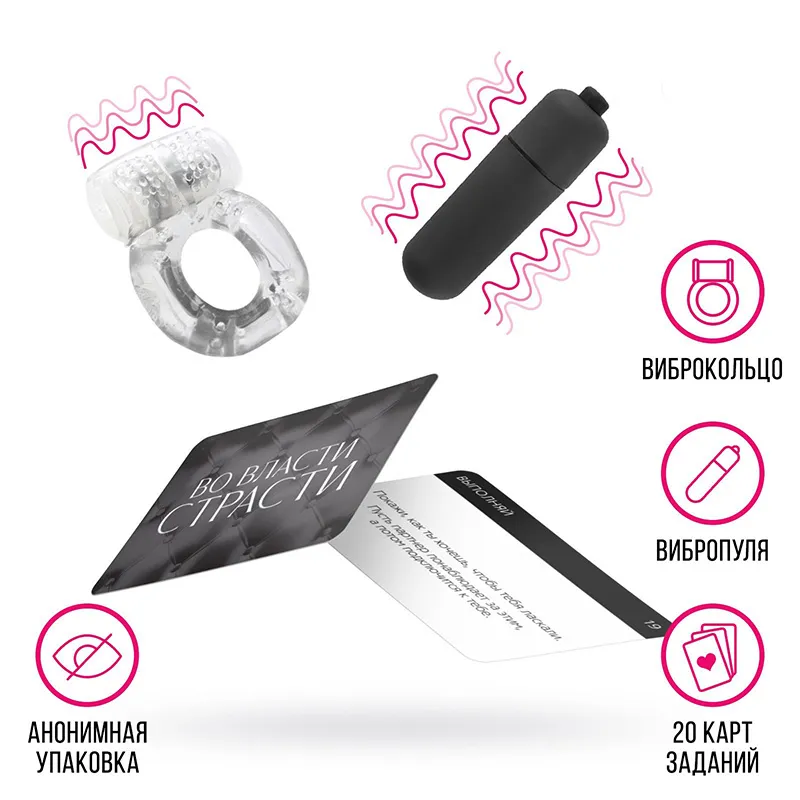 Пикантный секрет для вашего удовольствия Этот набор позволит вам разнообразить сексуальную жизнь и добавить в неё немного перчинки. Вас ждут 20 карт из серии «Во власти страсти» с пикантными вопросами и возбуждающими заданиями для игры в «Отвечай или выполняй». Также в комплект входят вибропуля и виброкольцо, которые подарят удовольствие обоим партнёрам.