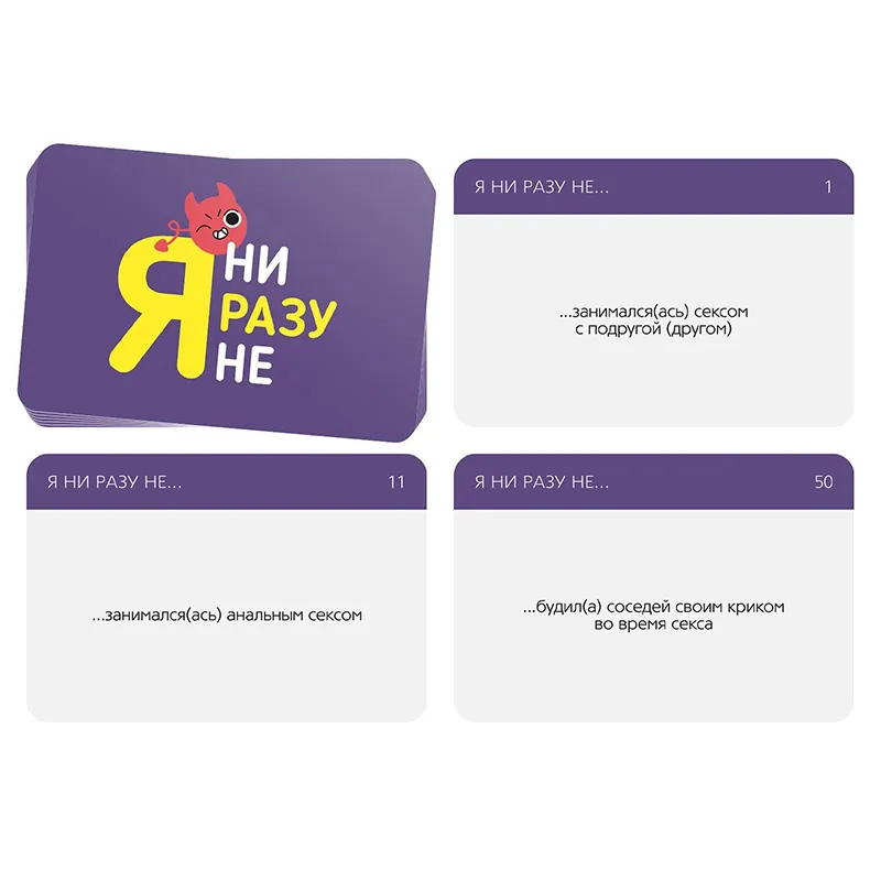Тебя ждет 50 карточек с утверждениями, каждое из которых начинается с фразы: «Я ни разу не…» Игроки вытягивают их по одной и зачитывают. А каждый, кто хоть раз совершал указанное действие, должен выполнить наказание, а какое именно – решает ваша компания! «Я ни разу не…» – это идеальный способ заново познакомиться со старыми друзьями и узнать новых людей с необычной стороны!