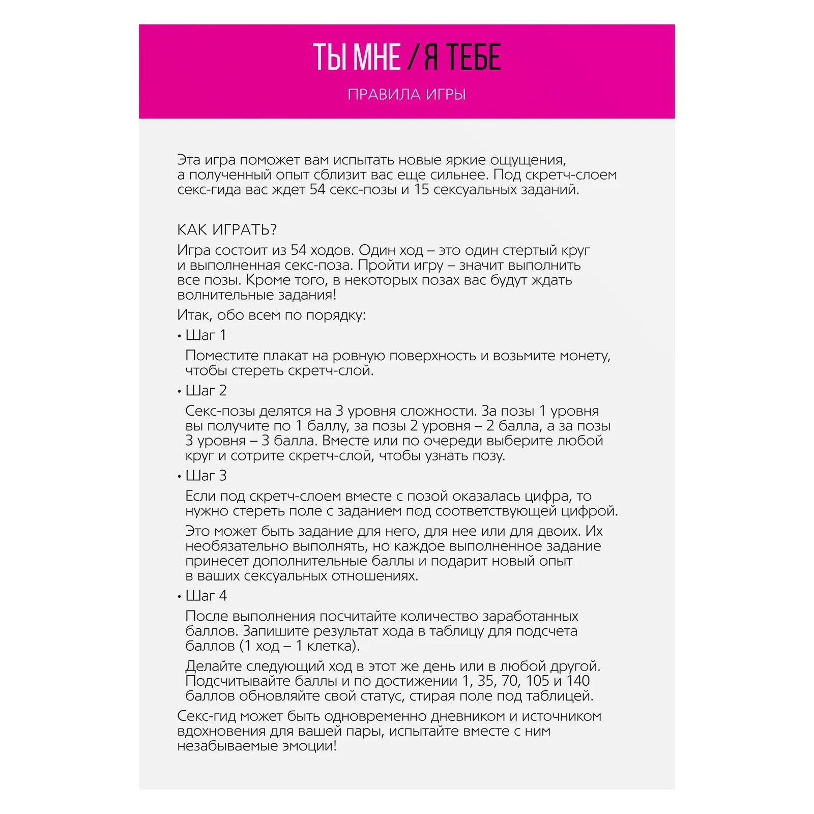 Игра состоит из 54 ходов. Один ход — это один стёртый круг и выполненная секс-поза. Пройти игру — значит выполнить все позы. Бонусом в некоторых позах вас будут ждать волнительные задания! Итак, обо всём по порядку: для начала поместите плакат на ровную поверхность и возьмите монету, чтобы стереть скретч-слой.