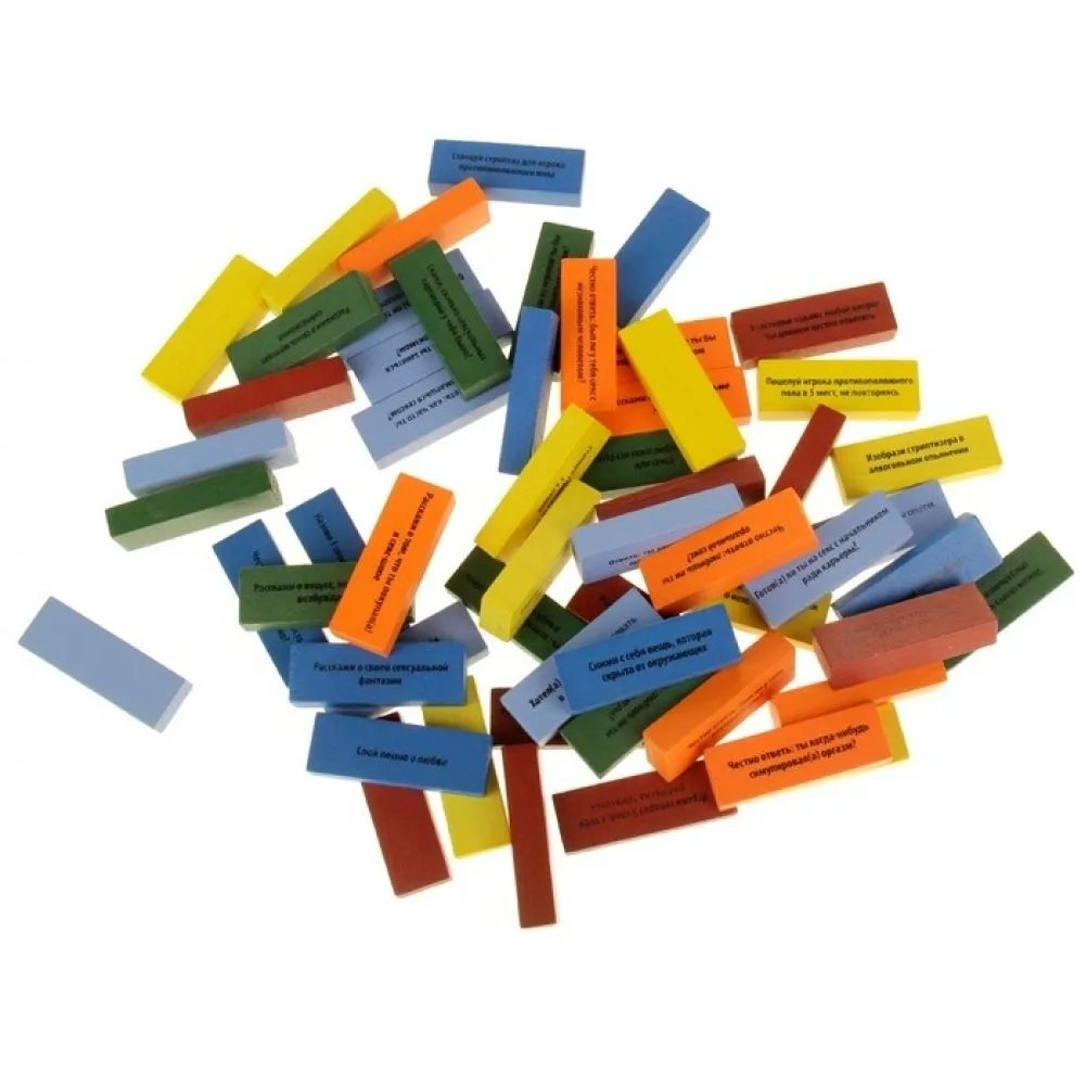 Это новая версия известной во всем мире игры «Падающая башня», или «Пьяная башня». Принцип игры «Башня страсти» прост. Для начала нужно построить из деревянных брусков небольшую башню, сложив их друг на друга. Затем игроки поочередно тянут из башни по одному бруску. Задача каждого игрока – вытянуть брусок так, чтобы башня не сломалась. На каждом бруске написано пикантное задание, которое предстоит выполнить тому, кто его вытянул.
