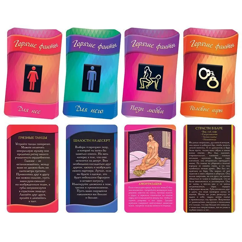 Перед вами игра, раскрывающая самые сокровенные фантазии. Игра, способная подарить невероятное наслаждение. Каждое задание, которое вы найдёте в ней, будет подливать масла в огонь ваших чувств, готовых запылать с новой страстью. Вас ждут невероятные сексуальные эксперименты, которые вознесут вас на вершину экстаза! В карточках «Для неё» вы найдёте задания, способные до предела возбудить желание партнера. Колода «Для него» таит в себе секреты наслаждения для партнерши. Карты «Позы любви» — это невероятные описания сексуальных позиций, сопровождающиеся откровенными иллюстрациями. А на сладкое - колода «Ролевые игры» — с ней вы подарите друг другу новые эмоции и ощущения.