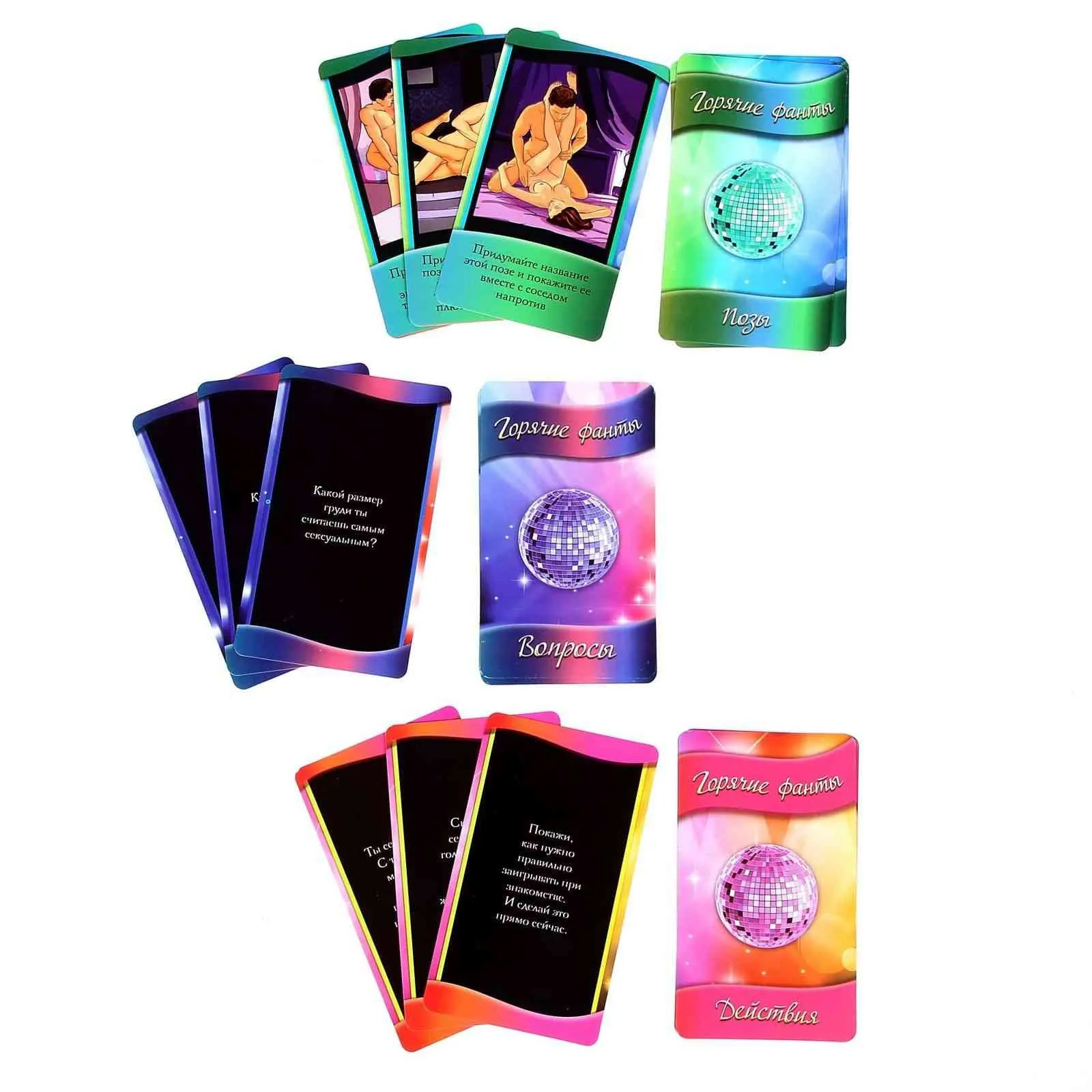 - В набор входит: 20 карт «Вопросы»; 10 карт «Позы»; 10 карт «Действия»; правила игры.