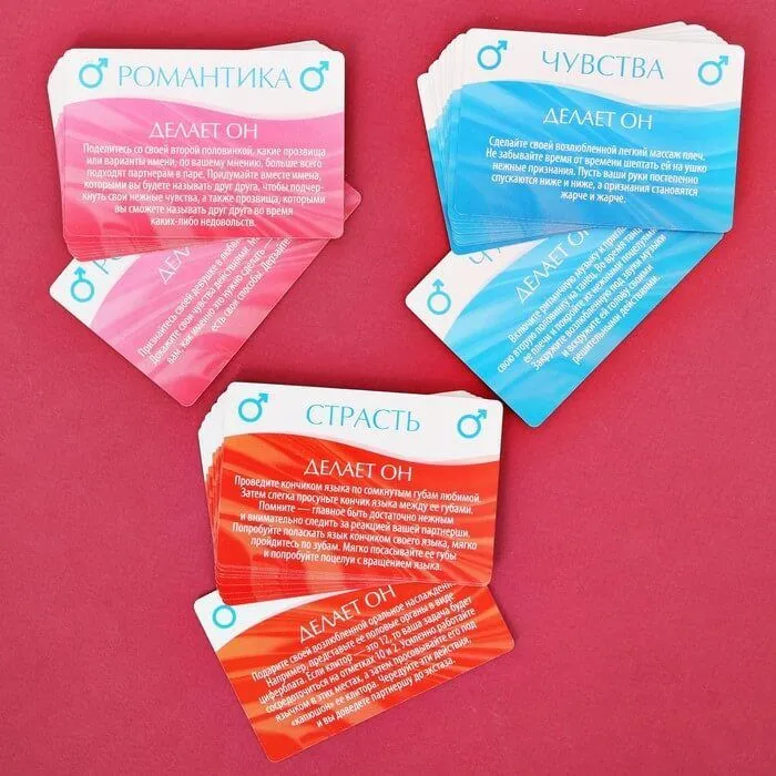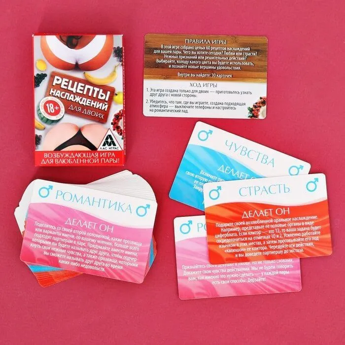 Игра для двоих Рецепты наслаждений идеально подойдет для проведения незабываемого вечера с Вашей второй половинкой. В наборе Вы найдете 30 карточек, с каждой стороны у которых есть задания для нее и для него. Карточки разделяются по цвету и задания на них варьируются от самых невинных до невероятно страстных. Вы можете выбрать только одну колоду, в зависимости от вашего настроения, а можете перемешать все карточки, чтобы нежные признания чередовались с жаркими ласками.