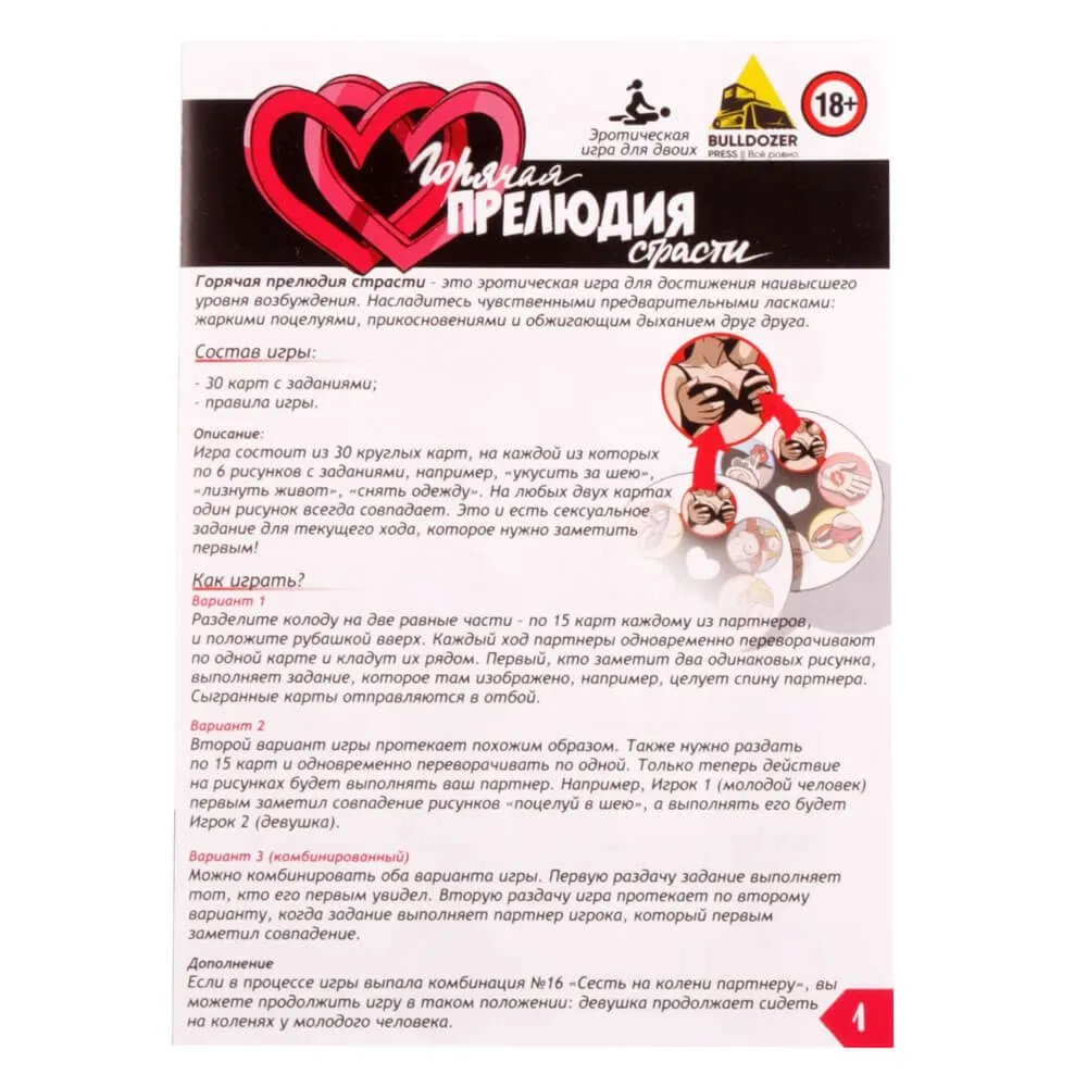 Эротическая игра "Горячая прелюдия страсти", верная своему названию, позволит партнерам достичь наивысшего уровня возбуждения. В процессе игры вы будете выполнять как чувственные и нежные задания, так и наиболее откровенные. Насладитесь жаркими поцелуями, укусами, прикосновениями и дыханием друг друга, от которых голова пойдет кругом от желания! Игра состоит из 30 круглых карт, на каждой из которых есть 6 разных рисунков. На любых двух картах один рисунок всегда совпадает.