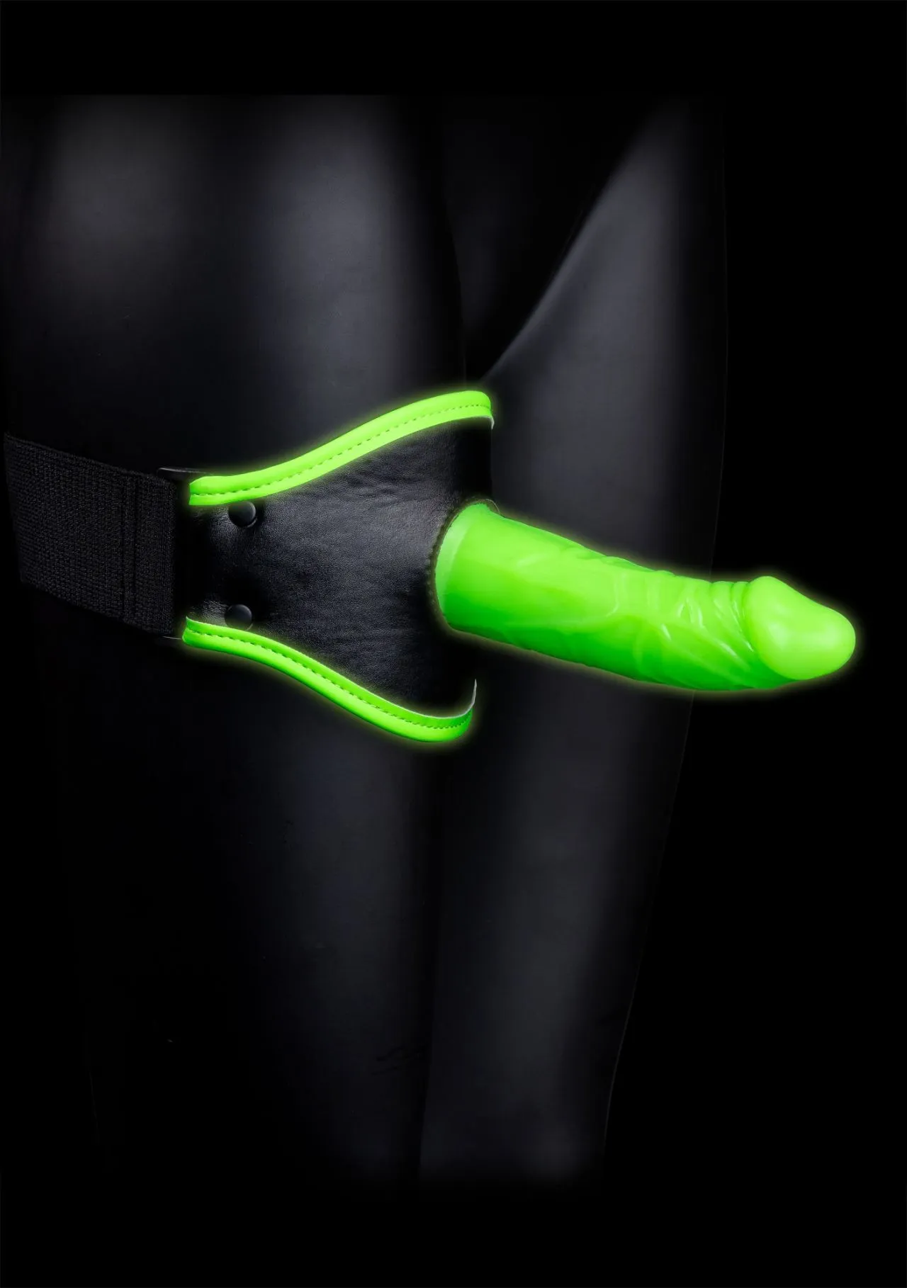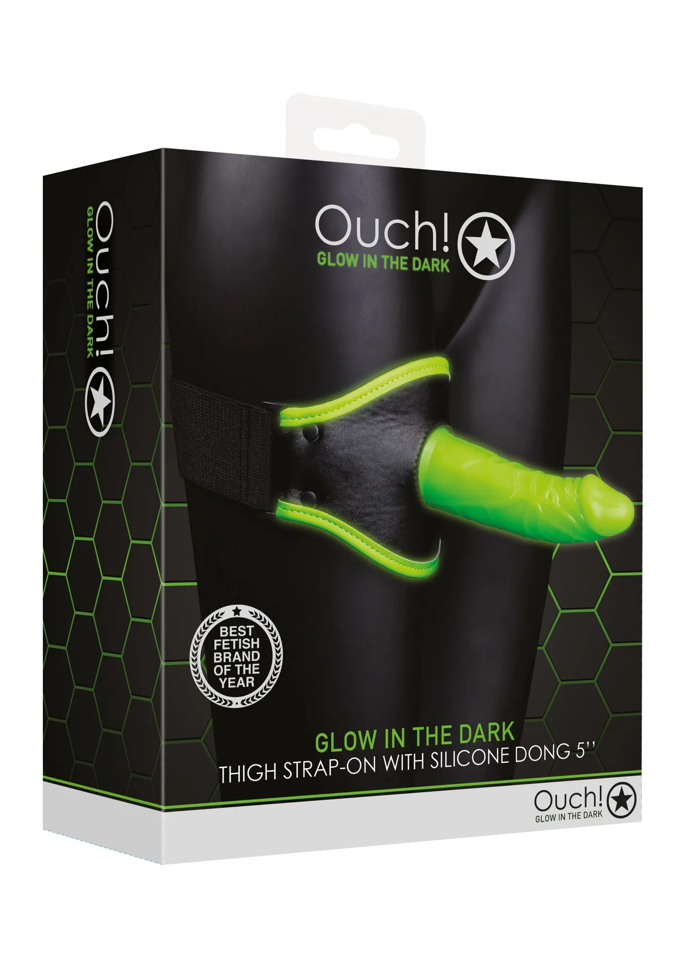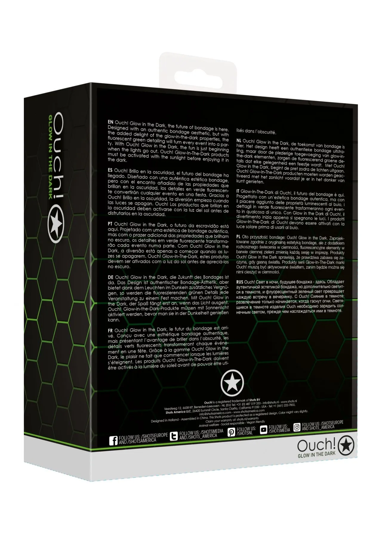 Повязка выполнена из кожи а сам фаллоимитатор из силикона, который светится в темноте. Предварительно нужно "зарядить" фаллоимитатор ярким светом, чтобы наблюдать яркий эффект в темноте.