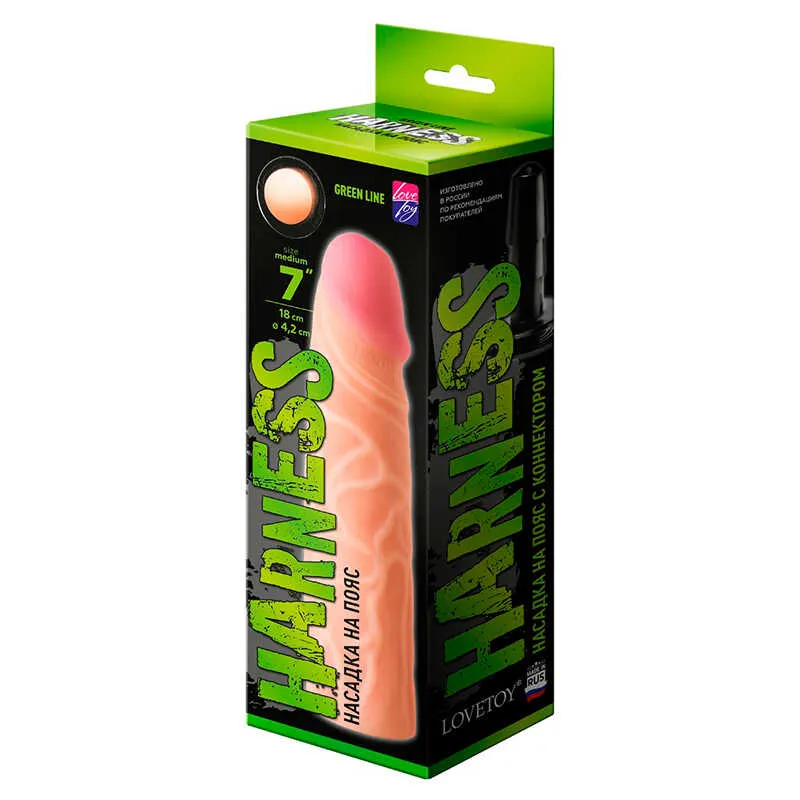 Насадка Harness 7 имеет длину 18 см., диаметр 4,2 см. Красивый рельеф имитирует облик полового члена с крупной, хорошо обозначенной головкой и рельефными складками.