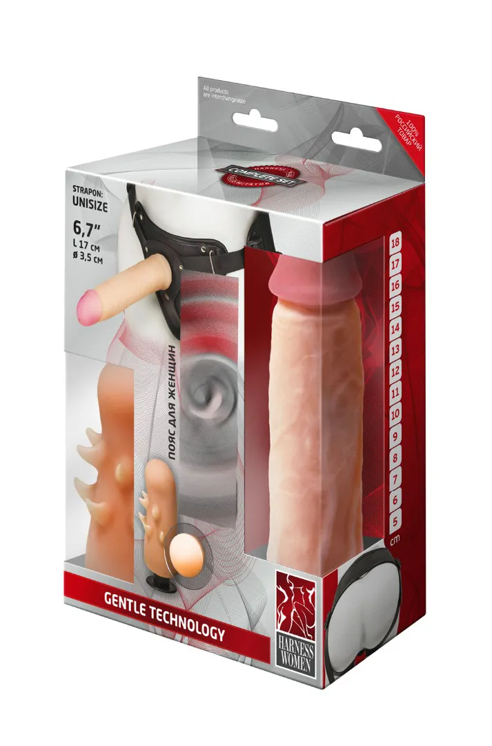 Harness-пояс для девушек. В комплект входят пояс-трусики и пара насадок.Конструкция трусиков такова, что позволяет использовать абсолютно любые насадки, которые легко крепятся при помощи штырьков, входящих в комплект. Внутренняя поверхность трусиков мягкая, не имеет швов, легко регулируется по размеру - что немаловажно. Два отверстия: одно внешнее - для любых насадок, на которые только способна ваша фантазия, второе - внутреннее,В данном комплекте две насадки разных размера и формы. Фаллоимитатор в виде члена с ярко выраженной головкой длиной 17 см и диаметром 3,5 см выполнен из мягкой Киберкожи. Вторая насадка имеет эргономичную компактную форму.Длина - 10 см, диаметр - 3,8 см. Упаковка- картонная коробка.
