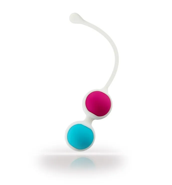 Вагинальные шарики, розового и синего цвета, из силикона. Шарики имеют удобную петельку для извлечения из тела. Длина тренажера 7 см (без петельки), длина петельки- 9 см. Диаметр каждого шарика 2,7 см. Вес шариков- 16 и 36 гр. Упаковка- картонная коробка.