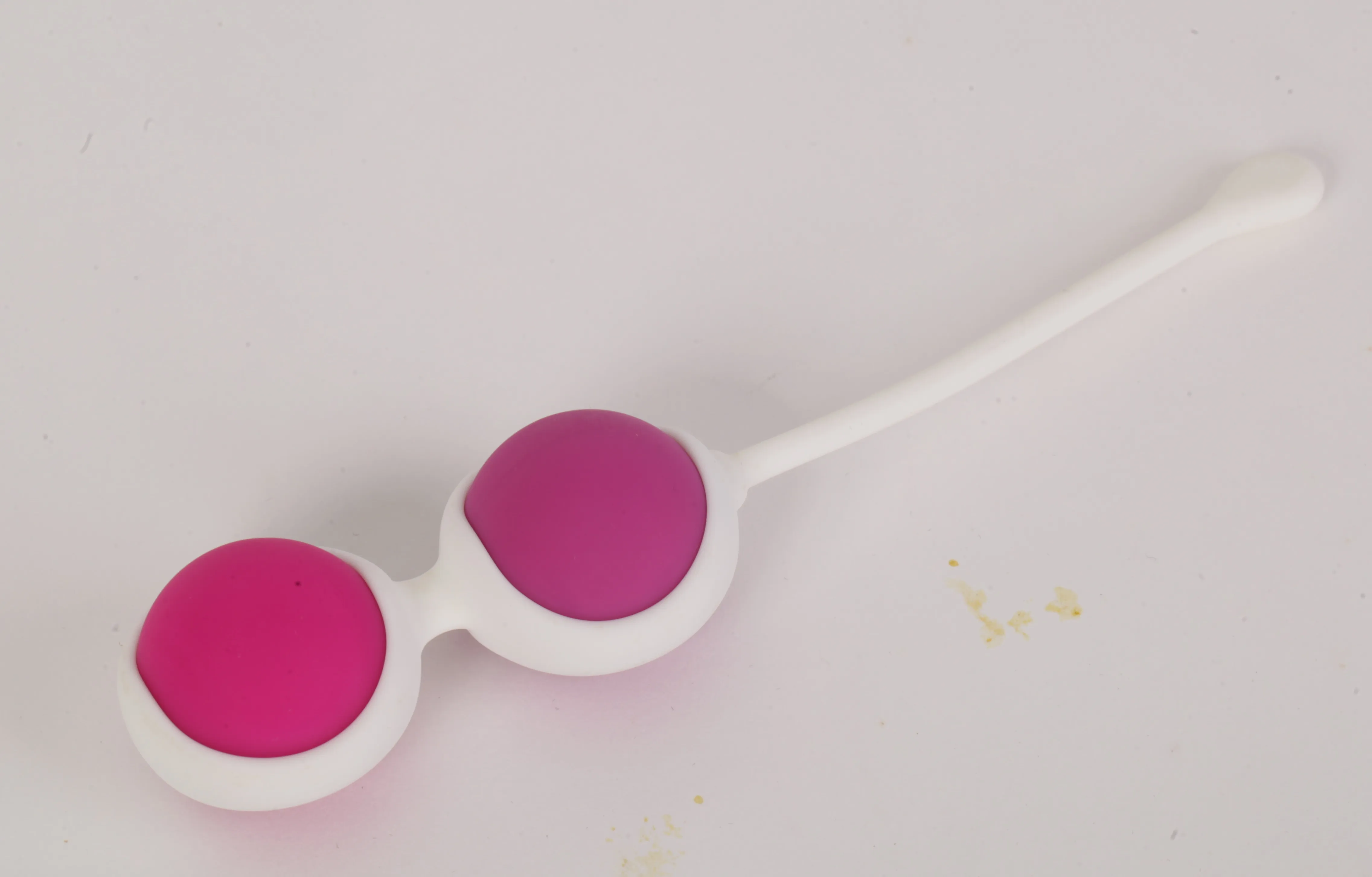 Вагинальные шарики, розового цвета, из силикона. Шарики имеют удобную петельку для извлечения из тела. Длина тренажера 7 см (без петельки), длина петельки- 9 см. В комплекте 2 шарика, диаметр каждого шарика 2,7 см. Вес шариков- 36 и 37 гр. Упаковка- картонная коробка.
