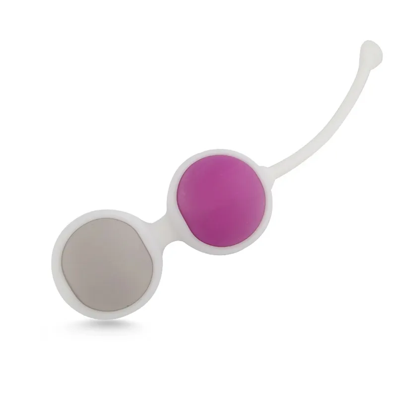 Вагинальные шарики, розового и серого цвета, из силикона. Шарики имеют удобную петельку для извлечения из тела. Длина тренажера 7 см (без петельки), длина петельки- 9 см. Диаметр каждого шарика 3 см. Вес шариков- 54 и 36 гр. Упаковка- картонная коробка.