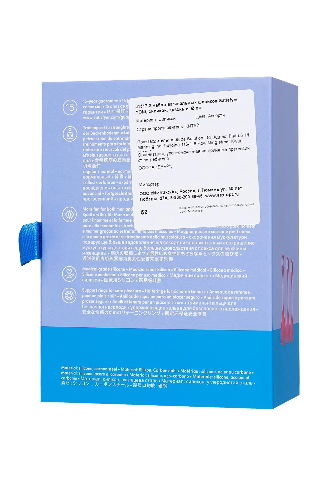 Satisfyer помогает заботиться об интимном здоровье женщин, и для этого был создан набор вагинальных тренажеров Yoni Power 1. Вагинальные шарики Yoni Power 1 разного размера помогают тренировать и укреплять мышцы тазового дна. Подобные тренировки помогают сделать интимную жизнь ярче, оргазмы интенсивнее, а кроме того, способствуют восстановлению мускулатуры после родов и операций. Вагинальные шарики Yoni Power 1 сделаны из медицинского силикона. Имеют цельное покрытие без швов и стыков, а значит использование безопасно и гигиенично. В тренировочном наборе 3 одиночных шарика с петельками для разных уровней тренировок: диаметр 2 см, вес 21 гр, длина 12 см диаметр 2,5 см, вес 45 гр, длина 13 см диаметр 3 см, вес 75 гр, длина 14 см Уделите всего 15 минут в день тренировкам с Yoni Power 1, и уже очень скоро удовольствие от секса качественно изменится как для женщины, так и для мужчины. Начинайте с самого тяжелого и большого шарика, чтобы затем перейти к самому маленькому и легкому. Используйте лубрикант на водной основе для комфортного введения и извлечения. Очищать шарики желательно до и после использования. Можно промыть в теплой воде с мылом или воспользоваться специализированным чистящим средством. Перед хранением их необходимо хорошо просушить. Желательно хранить отдельно от других силиконовых изделий. Надежный – гарантия 15 лет Безопасный и гигиеничный медицинский силикон Разный вес и диаметр – для эффективных тренировок Красивый и удобный – стильный дизайн, эргономичная форма и удобная петелька Водонепроницаемость IPX7 – новые возможности в удовольствии в душе и ванной Страна бренда – Германия