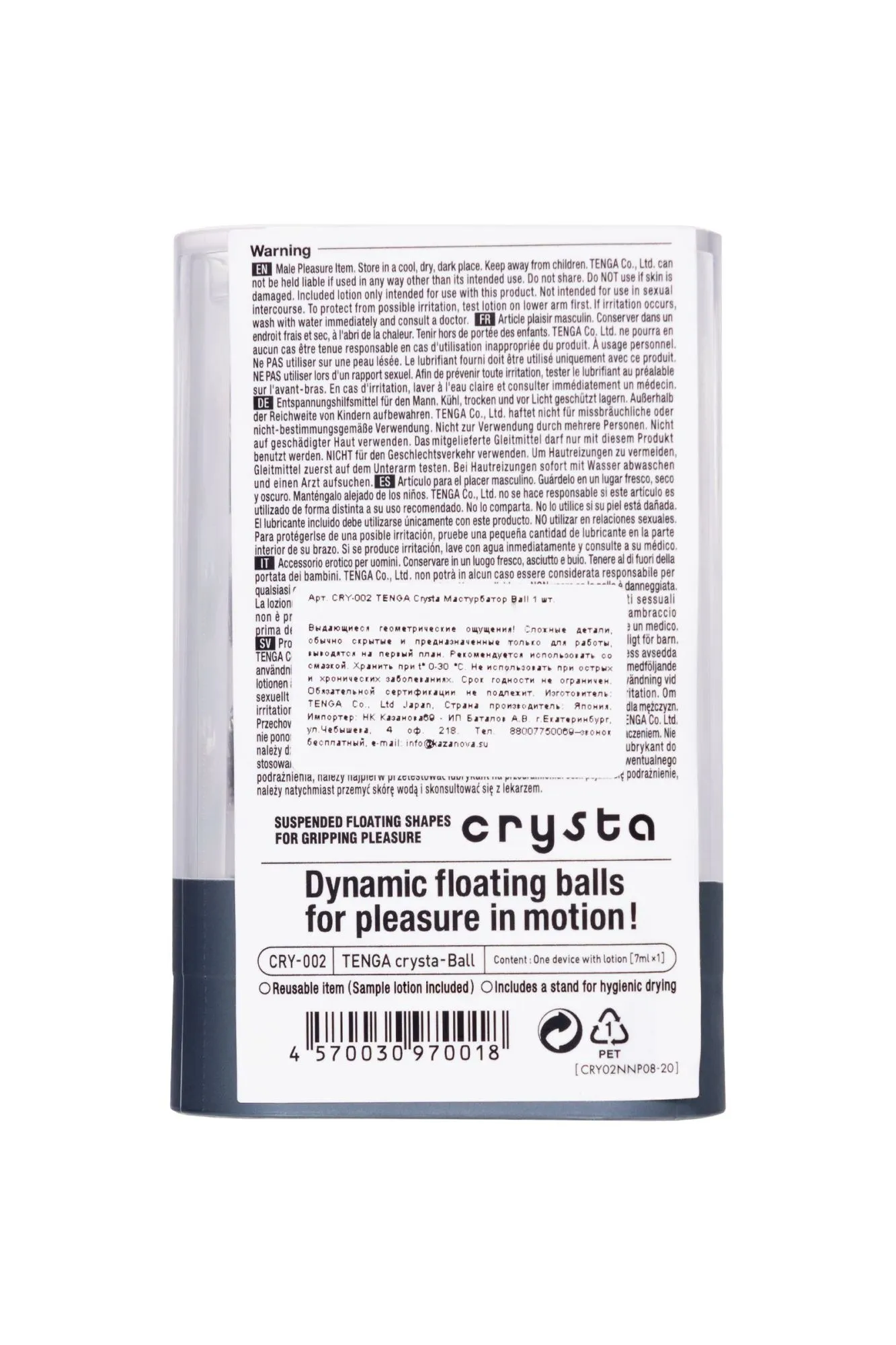 Функциональная форма и футуристичный дизайн делают коллекцию Tenga Crysta настоящим произведением искусства среди мужчских мастурбаторов. В динейке представлены три мастурбатора с различными рельефами. Текастура Ball состоит из множества сфер разного диаметра, расположенных вдоль узкого пузырчатого канала в хаотичном порядке.