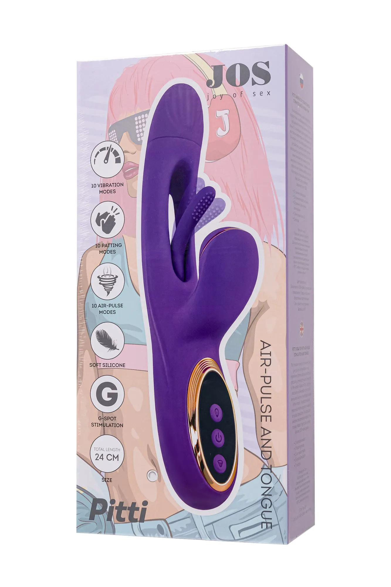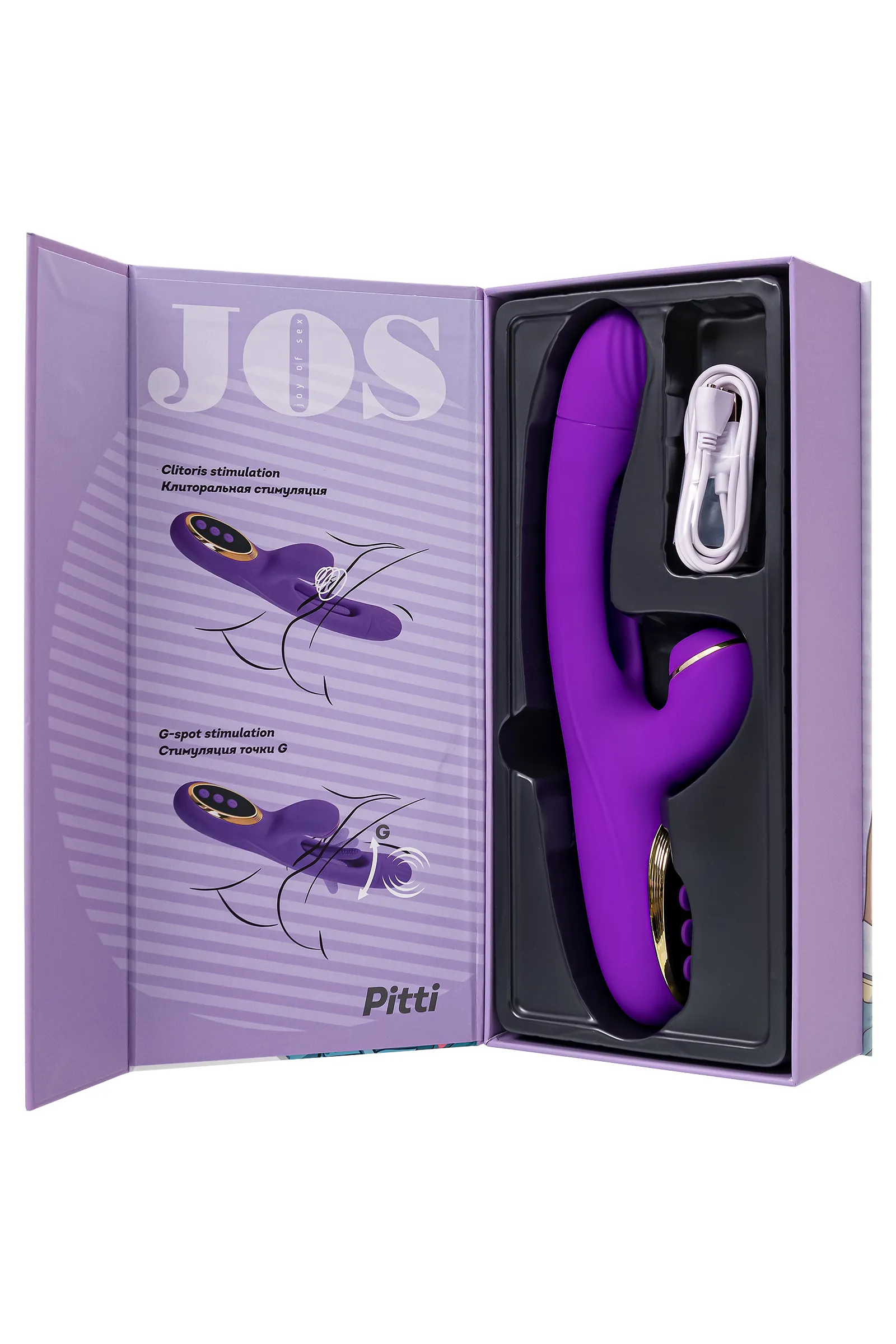 Погрузитесь в мир инновационных ощущений с вибратором PITTI от самого необыкновенного бренда JOS! Этот невероятный технологичный дизайн поднимет стимуляцию точки G на абсолютно новый уровень. Двигающийся язычок внутри вагинальной части точечно вибрирует непосредственно на зоне G, погружая вас в водоворот удовольствия. А клиторальный отросток в это время может ласкать вас вакуумными волнами воздушной пульсации. Тройное удовольствие гарантирует оргазм с максимальным уровнем экстаза. Управляйте своим наслаждением с легкостью! Три кнопки на основании вибратора контролируют каждый аспект удовольствия. Серединная кнопка включает устройство и переключает режимы основного вибратора. Кнопки ниже управляют режимами клиторального отростка. Верхняя кнопка изменяет режимы работы язычка. PITTI выполнен из высококачественного бархатистого силикона, обеспечивая максимальный комфорт. Заряжается от USB, что делает использование еще более удобным. Простое управление тремя кнопками гарантирует, что каждая функция будет под вашим контролем. Дизайн игрушки выполнен в насыщенном фиолетовом цвете с золотыми вставками. Головка погружного ствола имеет диаметр 3,3 см, а рабочая длина кролика составляет 13,5 см. Изготовленный из высококачественного бархатистого силикона, PITTI легко заряжается от USB, что делает его современным и практичным в использовании. Идеально гладкое и безопасное покрытие обеспечит вашей коже комфорт. Позаботьтесь о правильном хранении и уходе за PITTI, чтобы он всегда оставался вашим верным спутником в мире наслаждения. Используйте только водные лубриканты. После каждого использования промойте его мыльной водой и дезинфицируйте антибактериальным спреем, чтобы сохранить его гигиеничность и продлить его срок службы. Технические характеристики: 10 режимов вибрации 10 режимов вакуумной стимуляции 10 режимов работы язычка 3 мотора Стимуляция точки G Общая длина 24 см Рабочая длина 13,5 см Диаметр 3,3 см Материал - силикон, ABS-пластик Цвет - фиолетовый