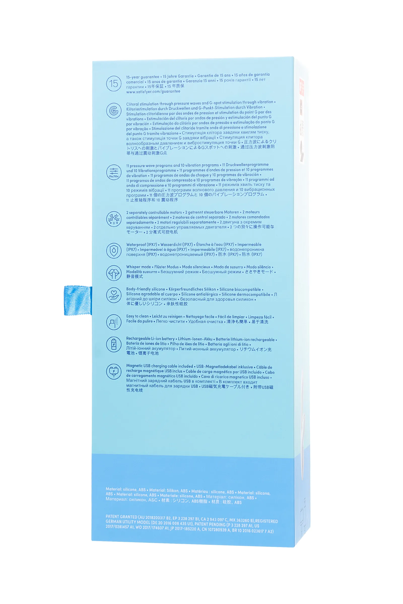 Одновременная стимуляция точки G и клиторальной зоны - непередаваемые ощущения, которые точно стоит испытать каждой женщине! Хотите в два раза больше удовольствия? Непревзойденное устройство от Satisfyer Pro G-Spot Rabbit обещает приключение, перед которым невозможно устоять. В отличие от обычных вибраторов-кроликов, Pro G-Spot Rabbit совмещает в себе вибрацию и бесконтактную технологию Air Pulse. Игрушка 2 в 1: вагинальный вибратор и вакуум-волновой стимулятор клитора. Воздействуйте на клитор, как со стороны головки, так и со стороны зоны G, чтобы получить сказочное наслаждение и удовольствие. С Satisfyer Pro G-Spot Rabbit точка G больше не будет неуловимой, ведь изгибистая часть непременно настигнет ее. Вагинальный отросток повторяет изгибы женской анатомии, оказывая целенаправленное воздействие вибрацией на заветную зону G. Ствол кролика умеренно гибкий и способен подстроиться под уникальность каждой женщины. В то время как внешний отросток неподвижный и уверенно стимулирует клитор пульсирующими воздушными волнами. Округлая насадка нежно обнимает клитор и уверенно ведет к пику наслаждения, чередуя всасывающие и давящие ощущения. Попробуйте 11 режимов стимуляции – от волнующе-возбуждающего до сверхмощного и принуждающего к фееричному оргазму! Возможность добавлять мощность или снижать ее, подключать вибрацию отдельно или использовать оба режима сразу – кролик не ограничивает. Сочетая различные режимы, можно подобрать любимую комбинацию под себя. Вознаграждение в виде множественных оргазмов не заставит себя ждать. Кролик белого цвета из нежного шелковистого силикона будет искушать вас снова и снова. Устоять перед чувственным наслаждением не получится. Экспериментируйте и получайте новые ощущения вместе с кроликом в душе или ванной. Осторожно, бесшумный кролик способен вызвать у вас много шума Он проведет вас дорогой наслаждения к фантастической кульминации. А сколько тайн он хранит в себе, но готов доверить вам?! 2 сверхмощных двигателя 3 скорости и 7 режимов вибрации Двойная стимуляция (вибрация и волнообразная пульсация) Безопасный и гигиеничный медицинский силикон Литий-ионный аккумулятор заряжаемый, в комплекте USB-кабель для зарядки Водонепроницаемый IPX7