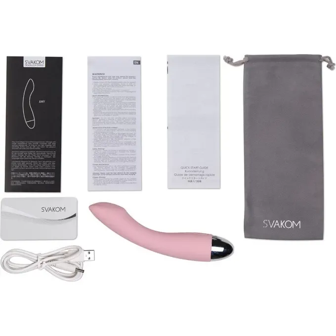 Разнообразная цветовая гамма AMY: нежно-розовый, черный, фиолетовый и песочный. У AMY современная и экологически безопасная упаковка. При покупке вы получаете изящный конверт и прочную коробку, сам продукт и мешочек для хранения, зарядное устройство, руководство пользователя, инструкции по уходу и описание сертификатов и гарантийная карта.