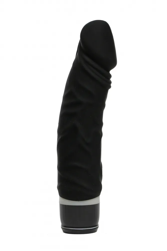 Вибромассажёр черного цвета. Имеет форму члена. Необычайно приятный, рельефный, выполненный из высококачественного силикона , передающий эффект мягкой реалистичной текстуры кожи, не имеет швов. Виброэлемент расположен по всей длине изделия. Вариации вибрации регулируются при помощи кнопки, расположенной в основании. Работает от 2-х батареек типа АА (в комплект не входят). Общая длина – 19,5см, основной диаметр 3,5 см, максимальный диаметр в изгибе головки -4,2 см. Упаковка в виде картонной коробки.