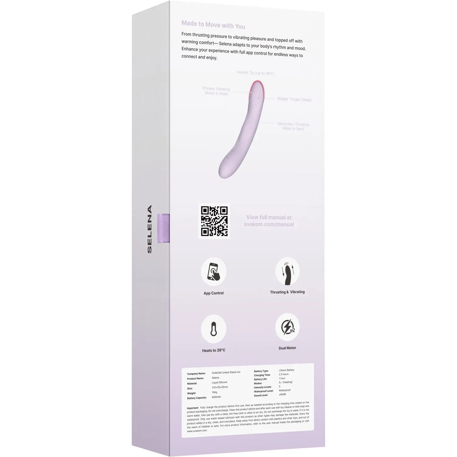 • Дополнительные преимущества: В комплект входит USB-зарядка. Selena полностью водостойка, что добавляет удобства и возможностей для использования в различных условиях. Возможность управления через приложения SVAKOM и KooSync.