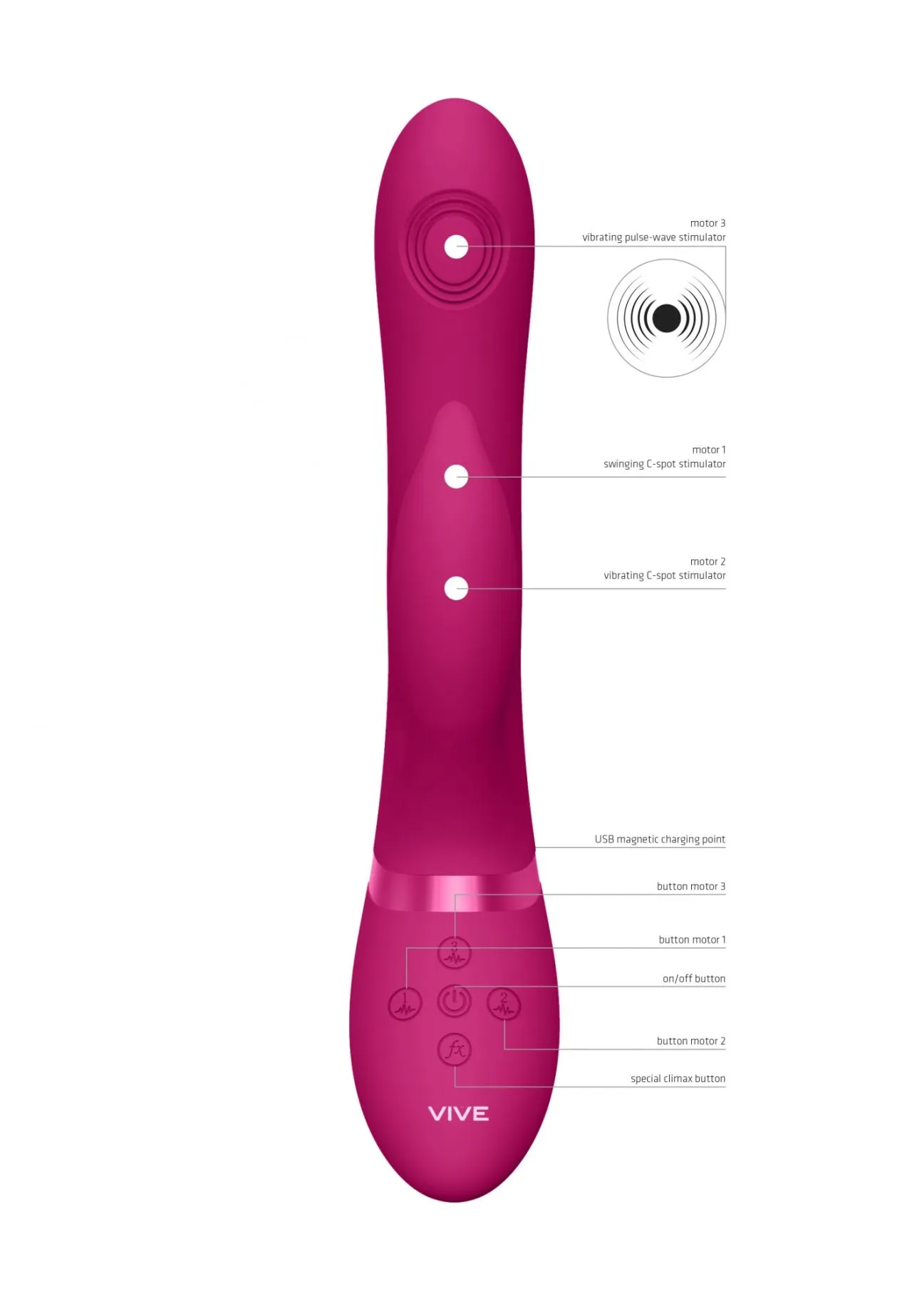 Изготовлено изделие из шелковистого медицинского (гипоаллергенного) силикона и как большинство моделей линейки VIVE имеет кнопку мгновенного оргазма, запуская все моторы на максимум одним касанием.