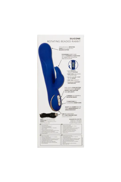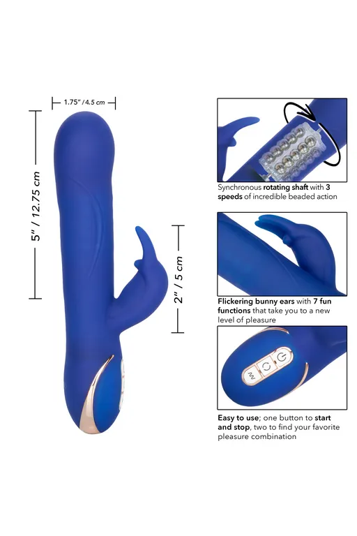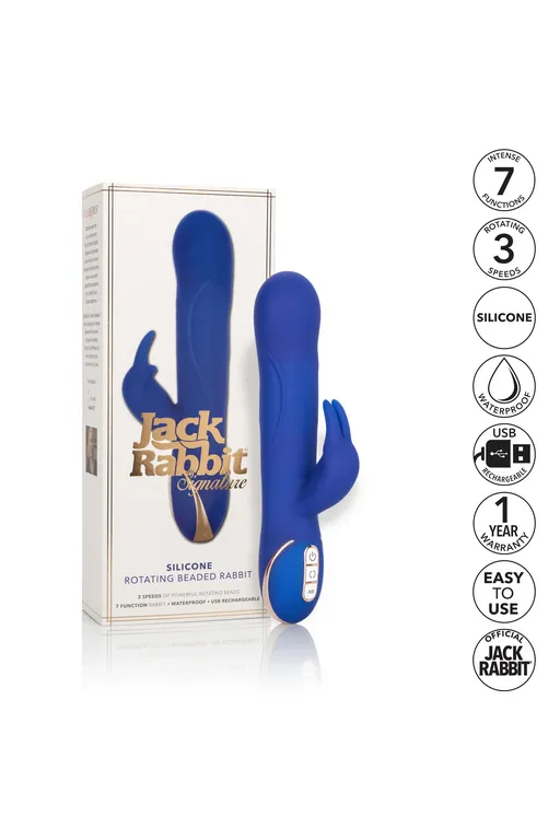 Вибромассажер Rotating Beaded Rabbit – роскошный вибромассажер с функцией «ротации». Особенностью этой линейки являеся собый мягкий и нежный силикон высшего качества, который создаёт уникальные ощущения от прикосновения и особым образом передает телу вибрации. Два самостоятельных мотора обеспечивают отдельно управление 7 идеальными функциями вибрации и 3 несравненные скорости синхронной ротации шариков.