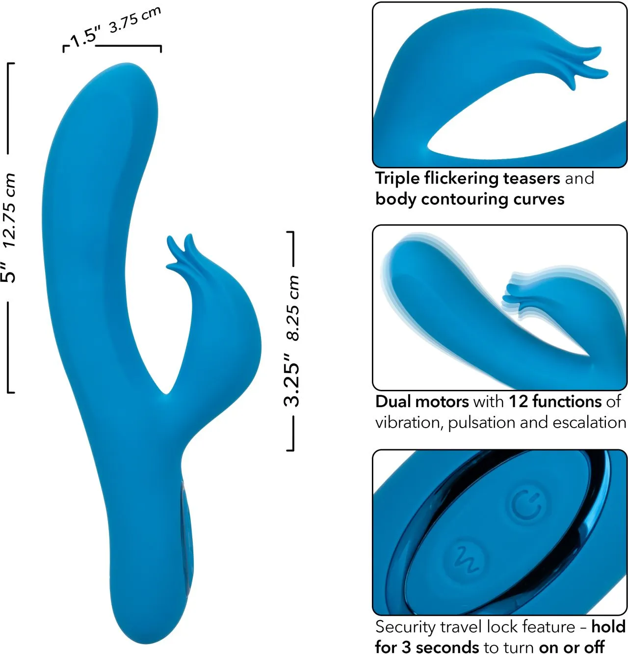 Flutter G- перезаряжаемый вибромассажер с клиторальным отростком в виде раскрывающегося бутона. Изготовлен из бесшовного, гипоаллергенного, безопасного для тела, не содержащего фталатов силикона премиум-класса. Два мощных мотора обеспечивают 12 интенсивных рисунков вибрации.
