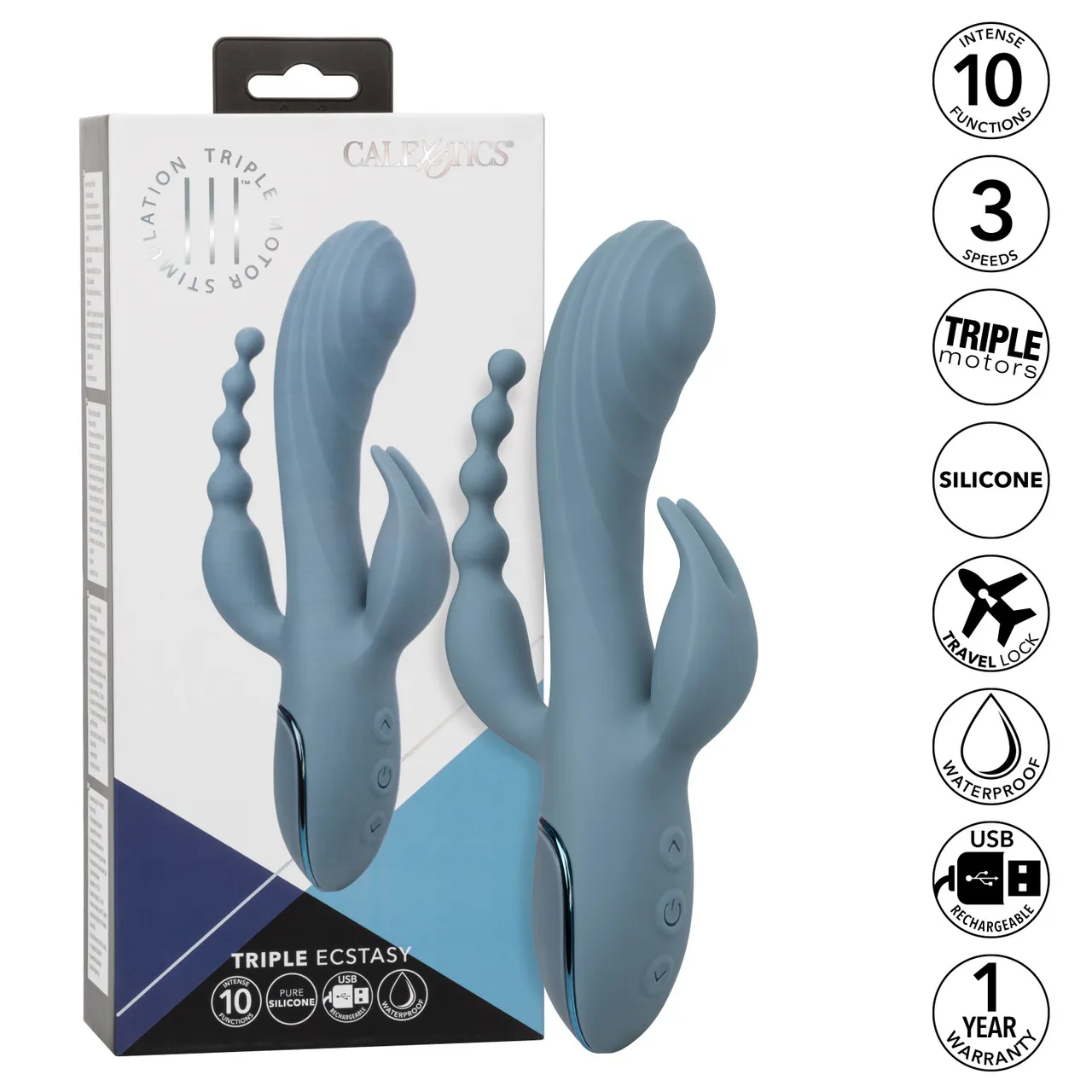 III Triple Ecstasy - вибромассажер с тройной стимуляцией! Этот вибратор имеет 3 мощных двигателя и обеспечивает 3 скоростями пульсирующего движения на кончике основного ствола, 10 функциями вибрации анальной елочки и 10 функциями вибрации клиторального отростка. Игрушка может одновременно стимулировать вагинальную, анальную и клиторальную зоны. Стимуляция на отростках может работать одновременно и по отдельности.