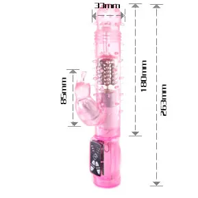 Вибромассажер с функцией вращения ствола и клиторальным стимулятором в виде зайчика. Имеет 6 режимов вибрациии и вращения. Данные режимы можно совмещать .Мягкий, по всей поверхности  мягкие пупырышки. Материал изготовления- ТРЕ ( гель). Работает от трех батареек типа ААА (нет в комплекте). Общая длина 22,5 см, рабочая длина 11,5 см, максимальный диаметр 3 см, длина стимулятора 5 см, диаметр 2,5 см. Упаковка- прозрачный пластик.