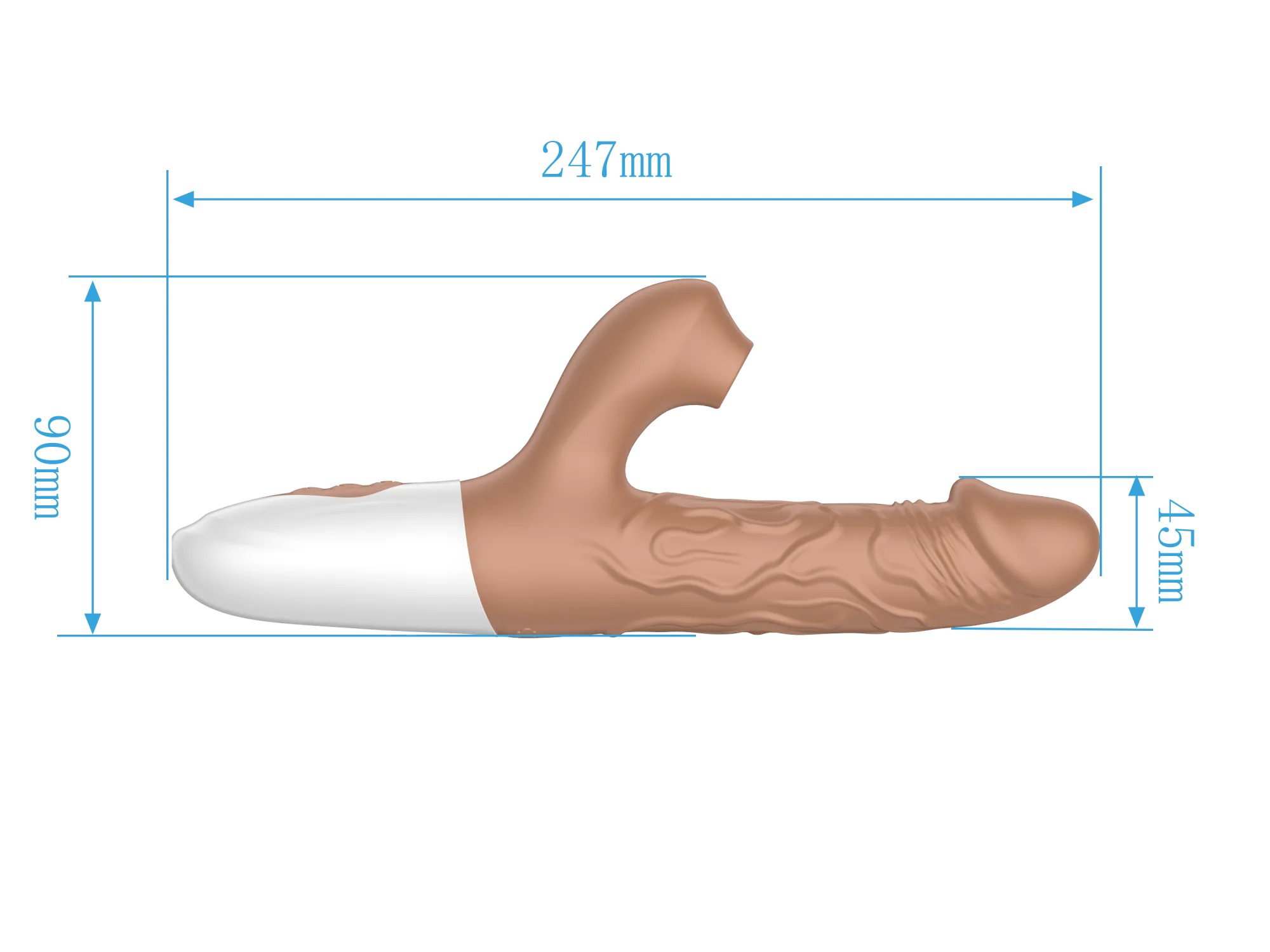 Вибратор-кролик в реалистичном дизайне в виде мужского пениса с текстурированными венами для большей стимуляции. Вибратор оснащен 10 режимами вибрации, 3 режимами пенетрации и 7 режимами сосания, что позволяет подобрать идеальную комбинацию для любого настроения. Изготовленный из мягкого и безопасного силикона с ABS-пластиком, вибратор приятен на ощупь и гипоаллергенен. Водонепроницаемость IPX7. Вес: 222 г., размеры: 225*90*40 мм. Длина клиторального отростка - 5см, ширина - 2,7см, диаметр раструба - 1,5см. Устройство оснащено перезаряжаемой литиевой батареей, которая обеспечивает до 45 минут работы. При этом уровень шума не превышает 50 дБ, гарантируя тихую и дискретную эксплуатацию.