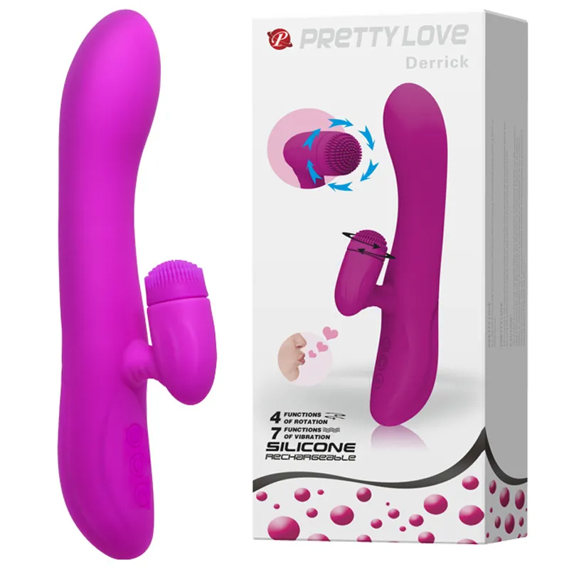 Силиконовый вибратор c клиторальным отростком с рельефной поверхностью в виде мягких отросточков. Имеет 7 режимов вибрации и 4 режима ротации клиторального стимулятора, лёгкое управление при помощи кнопок в основании. Имеет два моторчика. Материал изготовления- силикон. Общая длина-21 см, рабочая длина- 12,5 см, максимальный диаметр-3,5 см. Длина клиторального отростка-5,5 см, диаметр-2,3 см. Зарядка происходит от USB (в комплекте), имеется так же мешочек для хранения.
