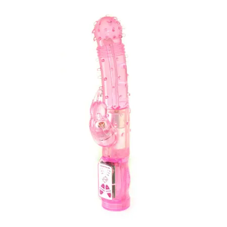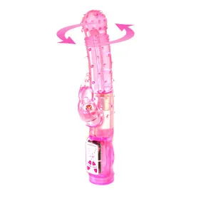 Вибромассажер с функцией вращения ствола и клиторальным стимулятором в виде кролика. Имеет 6 режимов вибрациии и вращения. Данные режимы можно совмещать. Мягкий, по всей поверхности мягкие пупырышки. Материал изготовления: ТРЕ ( гель). Цвет: розовый. Работает от трех батареек типа ААА (нет в комплекте). Общая длина 22 см, рабочая длина 11 см, максимальный диаметр 3 см, длина стимулятора 5 см, диаметр 2,5 см. Упаковка- прозрачный пластик.
