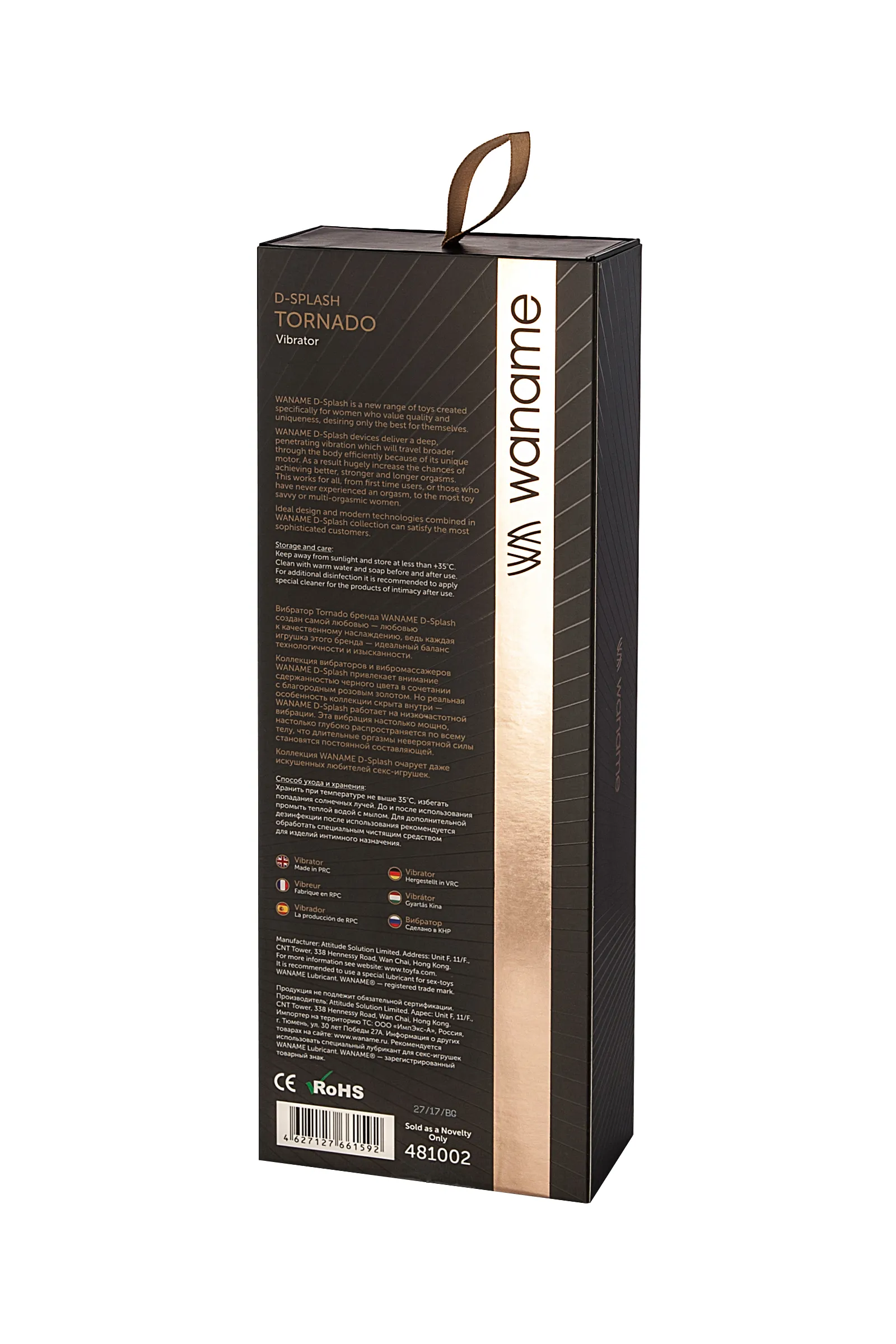 Роскошный ротатор с виброрежимами Waname D-Splash Tornado — это вихрь удовольствия, который сносит любые преграды к вашему оргазму. Он умчит мысли подальше от забот к океану ярких эмоций и успокоится только тогда, когда вы достигните желаемого. Впечатляющие круговые движения корпуса Waname D-Splash Tornado задействуют даже малоактивные эрогенные точки. Магическая низкочастотная вибрация завораживает глубоким и ровным распространением волн. Чуть загнутая головка и шесть мощных режимов (1 режим соло-ротации, 2 режима вибрации и 3 режима, совмещающие ротацию с волнами вибрации) дают возможность детально управлять наслаждением, легко подстраивая его под свое настроение. А полная водонепроницаемость позволяет перенести интимные ласки из спальни в бодрящий душ, усиливая тем самым ваше впечатление от игры. Ротатор с виброрежимами Waname D-Splash Tornado — оргазм, которого у вас еще не было.