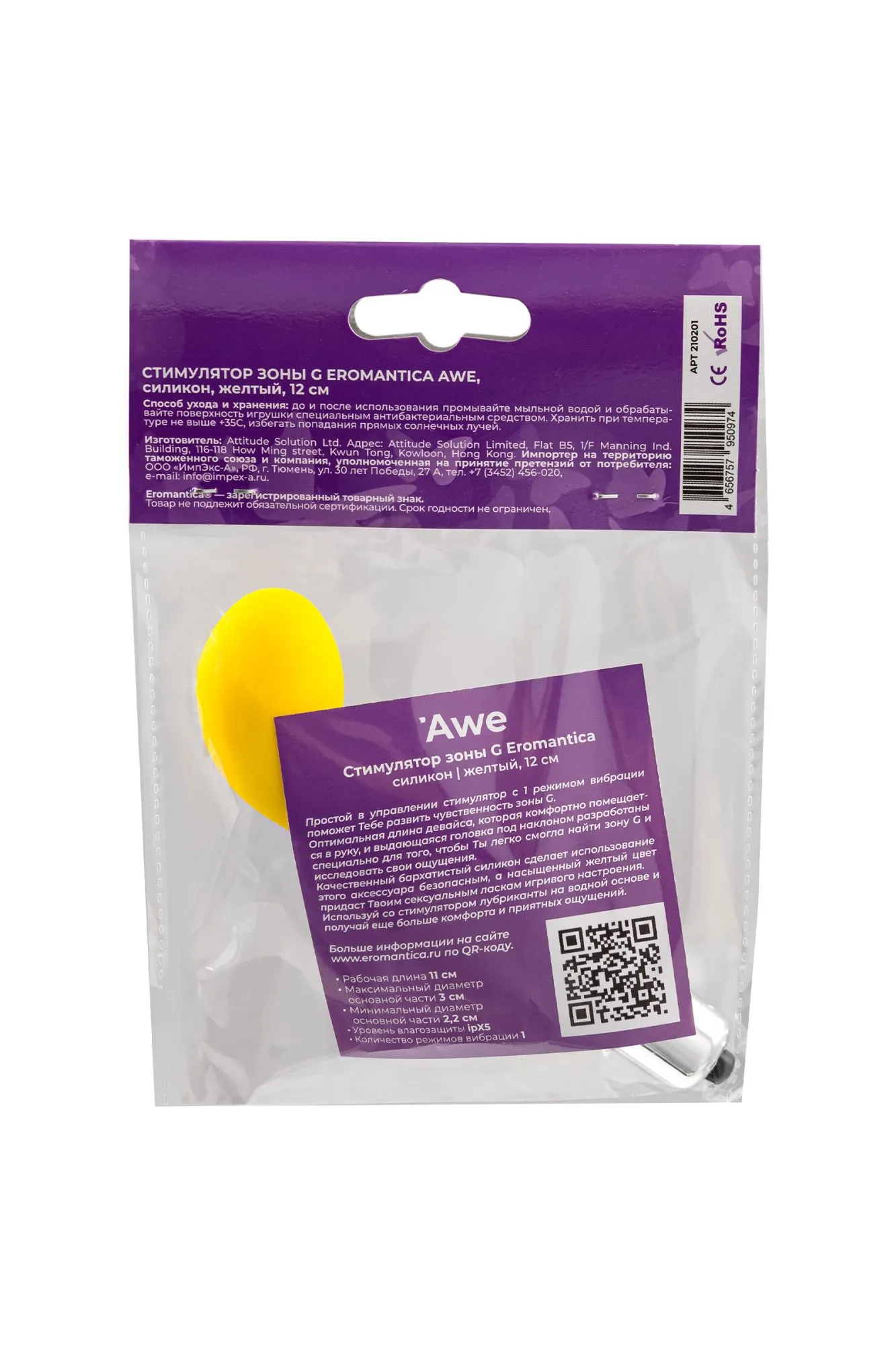 —Стимулятор точки G Eromantica Awe, силикон, желтый, 12 см