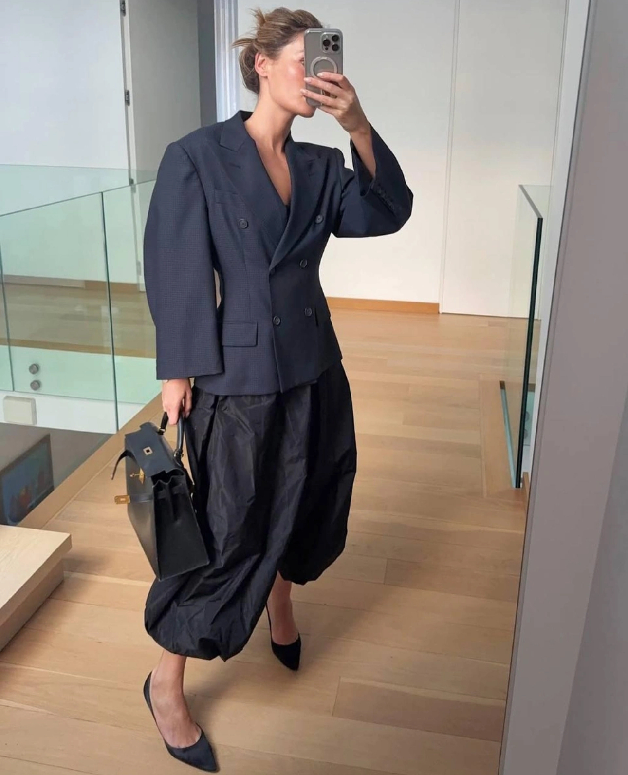 Секрет в балансе. Хочется подчеркнуть объем — выбирайте мягкие свитера или жакеты с акцентом. Предпочитаете стройность и чёткую линию — комбинируйте с облегающим верхом. А если мечтаете о драме — дерзайте, сочетайте с пышным верхом, но добавьте пояс или каблук, чтобы «собрать» образ и вытянуть силуэт.